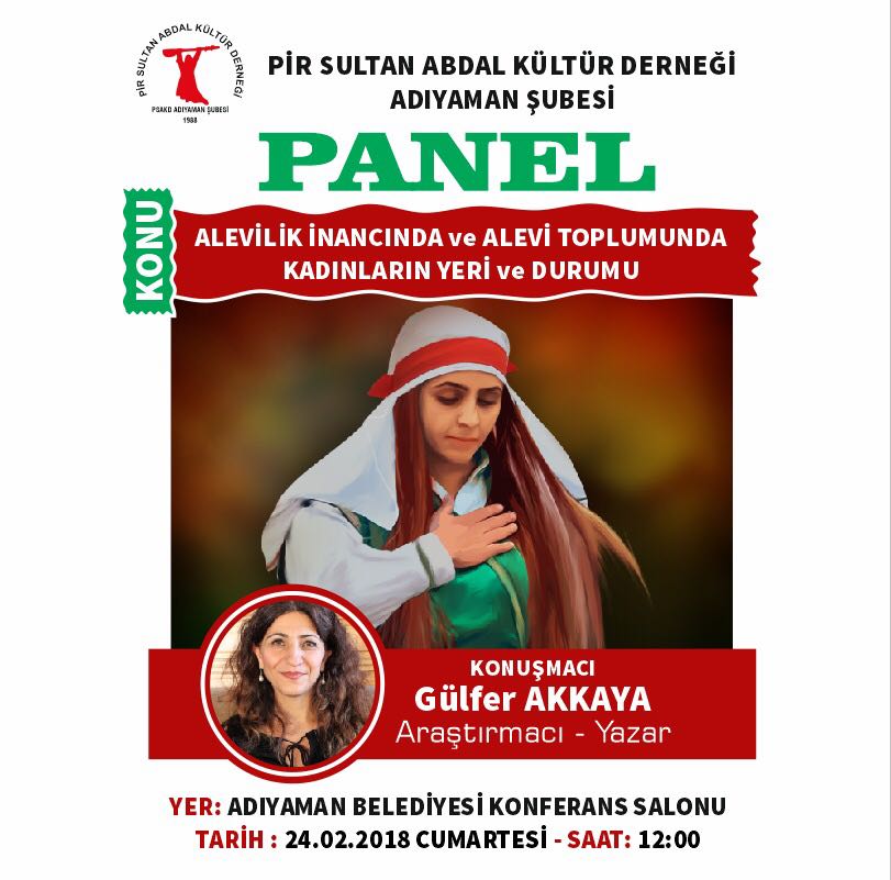 Pir Sultan Abdal Kültür Derneği Adıyaman Şubesi (PSAKD) Gülfer Akkaya’nın konuşmacı olarak katılacağı “Alevilik inancında ve Alevi toplumunda kadınların yeri ve durumu” konulu panel düzenleyecek. Adıyaman Belediyesi konferans salonunda 24 Şubat Cumartesi günü saat 12.00’de düzenlenecek panele PSAKD Adıyaman Şube Yönetim Kurulu üyesi Tuncay Kaya yaptığı açıklama ile katılım çağrısında bulundu.
