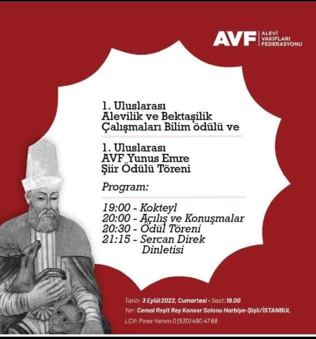 PİRHA- Alevi Vakıfları Federasyonu (AVF), 1. Uluslararası Alevilik ve Bektaşilik Çalışmaları Ödülü ve 1. Uluslararası AVF Yunus Emre Şiir Ödülü için tören düzenleyecek. Ödül töreni 3 Eylül Cumartesi günü Harbiye’deki Cemal Reşit Rey Konser Salonu’nda yapılacak.