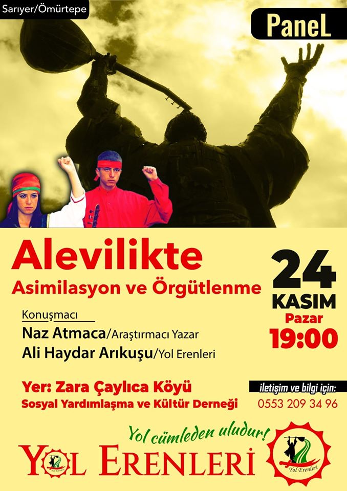 Yol Erenleri Derneği, İstanbul Sarıyer Ömürtepe’de bulunan Zara Çaylıca Köyü Derneği’nde ‘Alevilikte Asimilasyon ve Örgütlenme’ başlığıyla panel düzenleyecek.