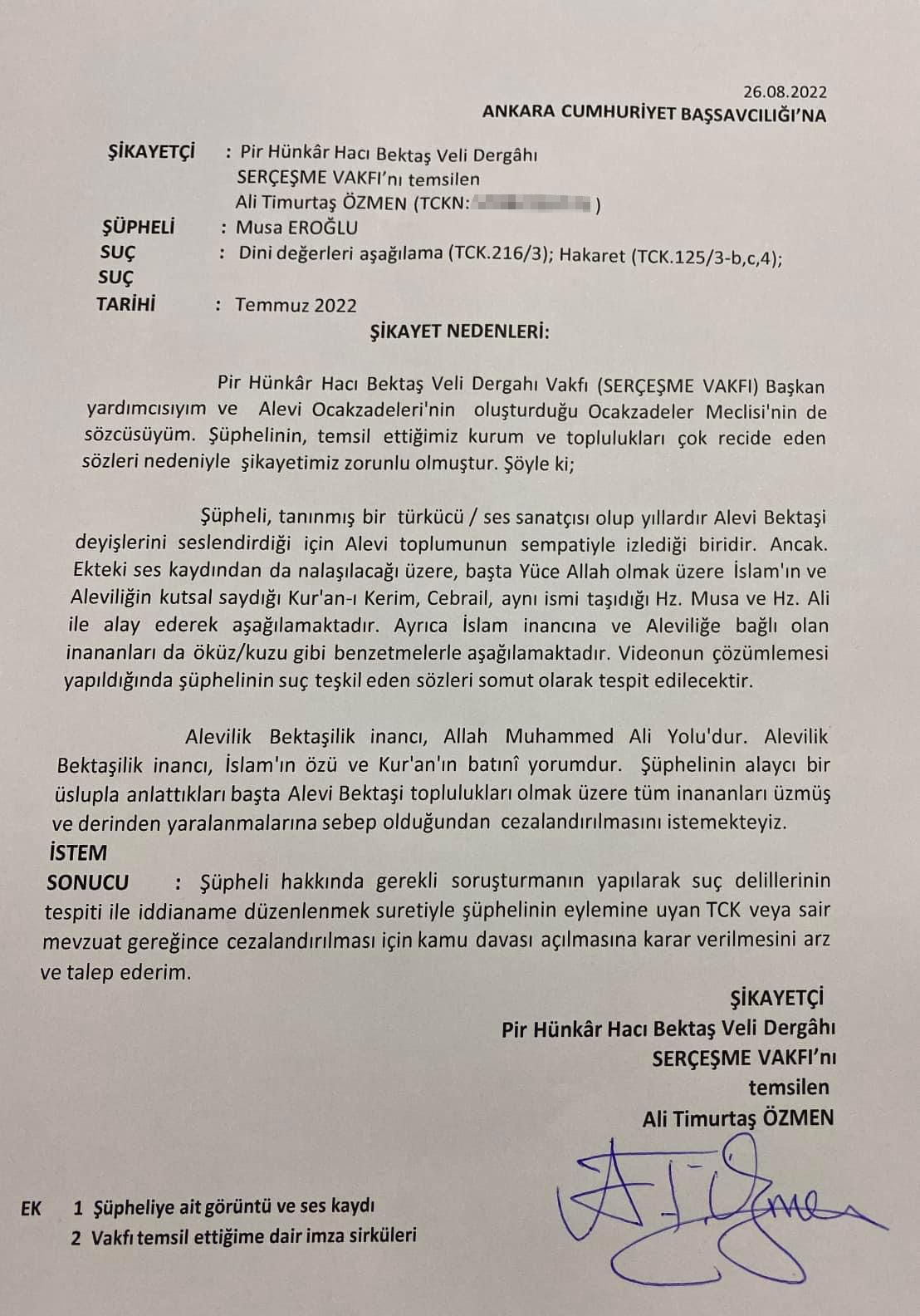 Pir Hünkar Hacı Bektaş Veli Dergahı/Serçeşme Vakfı adına Ali Timurtaş Özmen, Sanatçı Musa Eroğlu hakkında ‘dini değerleri aşağılama ve hakaret’ suçlarını işlediği iddiasıyla suç duyurusunda bulundu.
