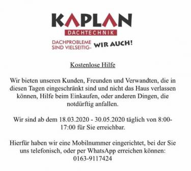 Kaplan, firmasının bulunduğu Grevenbroich ve çevresinde evlerinden çıkamayan insanların ihtiyaçlarını karşılamak için firma çalışanlarını görevlendirerek araçlarını ücretsiz hizmete sundu.