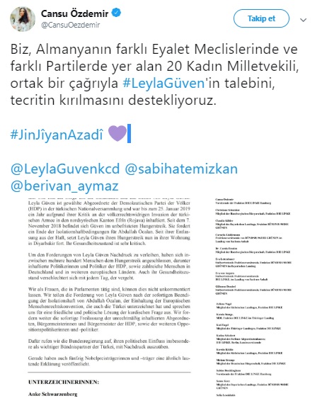 Almanya’nın farklı eyaletlerinden 20 parlamenter kadın, 99 gündür açlık grevi eylemini sürdüren Leyla Güven için ortak bir deklarasyon yayınladı, “Bizler de Güven gibi bir an önce tecridin kaldırılmasını talep ediyoruz.”