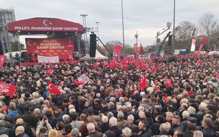 Kendilerini buraya getiren şeyin yaşadıkları adaletsizlik olduğunu söyleyen CHP Genel Başkanı Kemal Kılıçdaroğlu, “Hepinizin huzurunda söz veriyorum adalet ya gelecek ya gelecek. Adaleti dağıtacak kişi hukukun üstünlüğü ve vicdani kanaatine göre karar vermek zorundadır bu yapılmazsa adaletsizlik olur. Milletin iradesine bugün darbe vurulmuştur. 16 milyon İstanbullunun iradesine bir yargıç aracılığıyla darbe vurulmuştur. Adalet bugün temel bir Türkiye sorununa dönüşmüştür. Çünkü sokakta herhangi bir vatandaşa sorun bu ülkede adalet var mı diye emin olun büyük bir kısmı bu ülkede adalet yoktur diyecek. Biz altılı masa olarak adaleti bu ülkeye mutlaka ama mutlaka getireceğiz. Bugün Türkiye’de hukukun üstünlüğü değil, üstünlerin hukuku var bu manzarayı bitireceğiz. Şunu herkes çok iyi bilsin Ekrem Başkan hakkında verilen karar bize bir milim geri adım attırmayacaktır. Adalet ağacının içindeki kurtları tek tek temizleyeceğiz. Açık ve net ifade edeyim hiç kimse hiçbir güç Ekrem İmamoğlu’nu İstanbul’a hizmet etmekten alıkoyamaz. Adaletsizliği kural haline getirenleri göndereceğiz, tüyü bitmemiş yetimin hakkını yiyenleri göndereceğiz, milli iradeye darbe yapanları göndereceğiz. Hiç endişe etmeyin, altılı masa kararlı bu ülkeye huzuru, bereketi, adaleti getireceğiz. Hiç kimse unutmasın ve umutsuzluğa kapılmasın” diye konuştu.