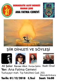 Paylaş PİRHA-Demokratik Alevi Derneği Mamak Şube Ana Fatma Cemevi’nde şiir dinletisi ve söyleşi gerçekleştirilecek. 1 Aralık Cumartesi saat 16.00’da yapılacak etkinliğe Ali Şeker, Kevser Akın, Huriye Şahin, Kadri Önal katılacak. Okumaya devam et Paylaş