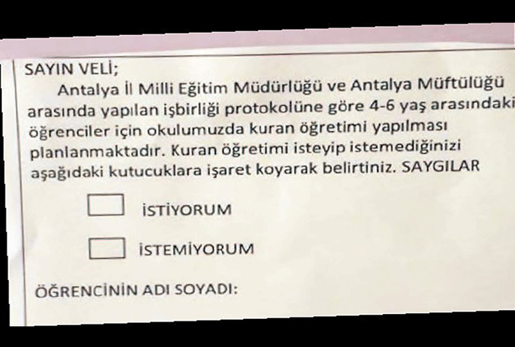 Antalya Milli Eğitim Müdürlüğü, müftülük ile imzalanan protokol kapsamında, anaokulundaki çocuklara yönelik verilecek din eğitimi için velilere izin belgesi gönderdi. Belgede “İl Milli Eğitim Müdürlüğü ve müftülük arasında yapılan işbirliği protokolüne göre 4-6 yaş öğrenciler için okulumuzda Kuran öğretimi yapılması planlanmaktadır. Kuran öğretimi isteyip istemediğinizi belirtiniz” denilerek velilere istiyorum-istemiyorum seçenekleri sunuldu. (HABER MERKEZİ)