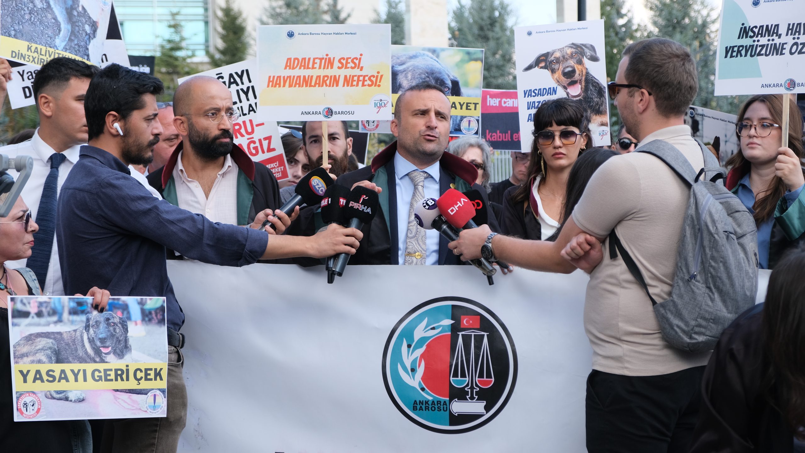 PİRHA- Ankara Barosu, AYM önünde basın açıklaması yaptı. Baro Başkanı Av. Mustafa Köroğlu, “Sokakta yaşayan hayvanlarının rehabilite edilmesini, kısırlaştırılmalarını ve sokaklarında sağlıklı bir şekilde yaşamalarını sağlayamayan devletin bir sosyal devlet olmadığı açıktır” dedi.