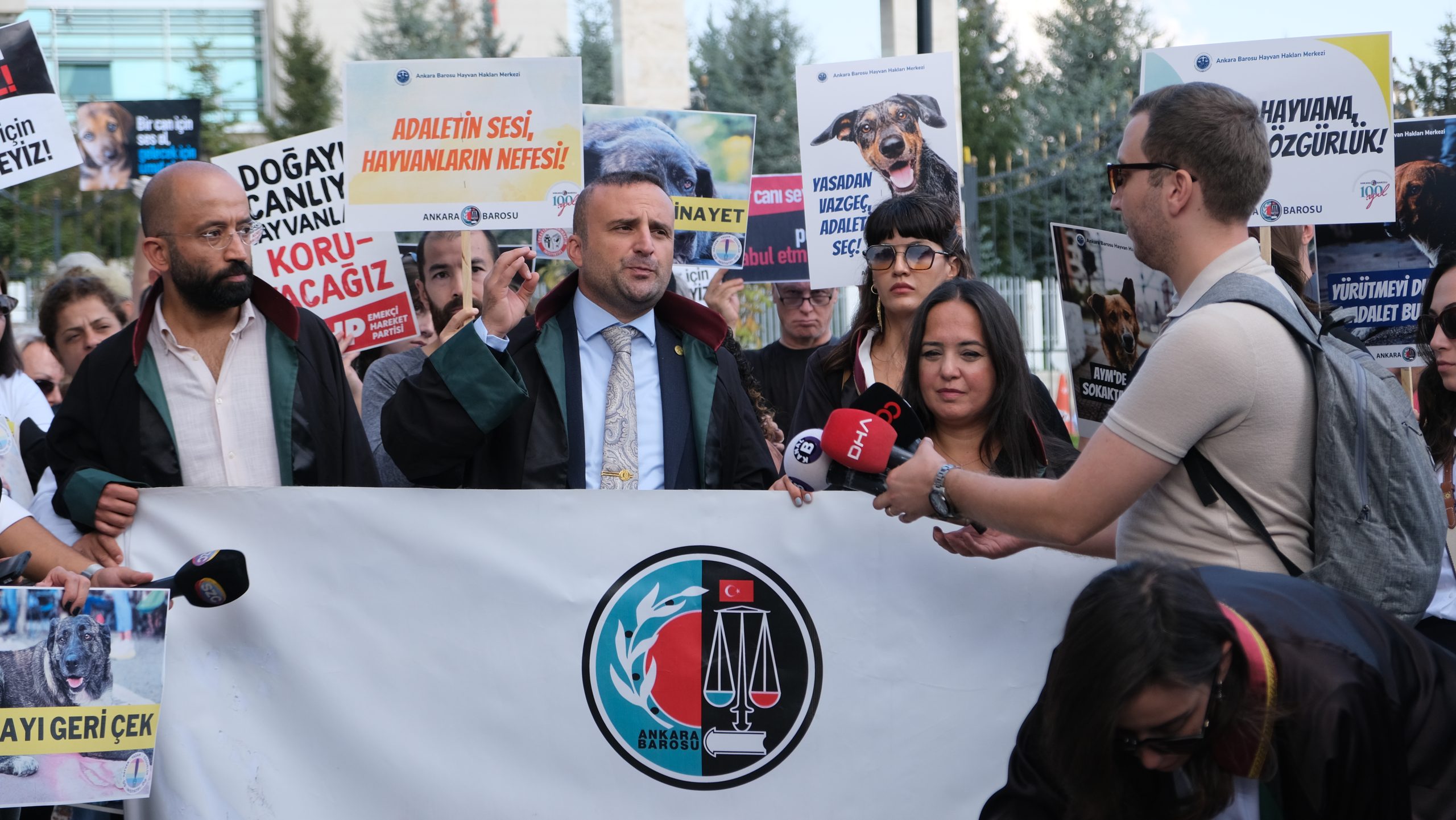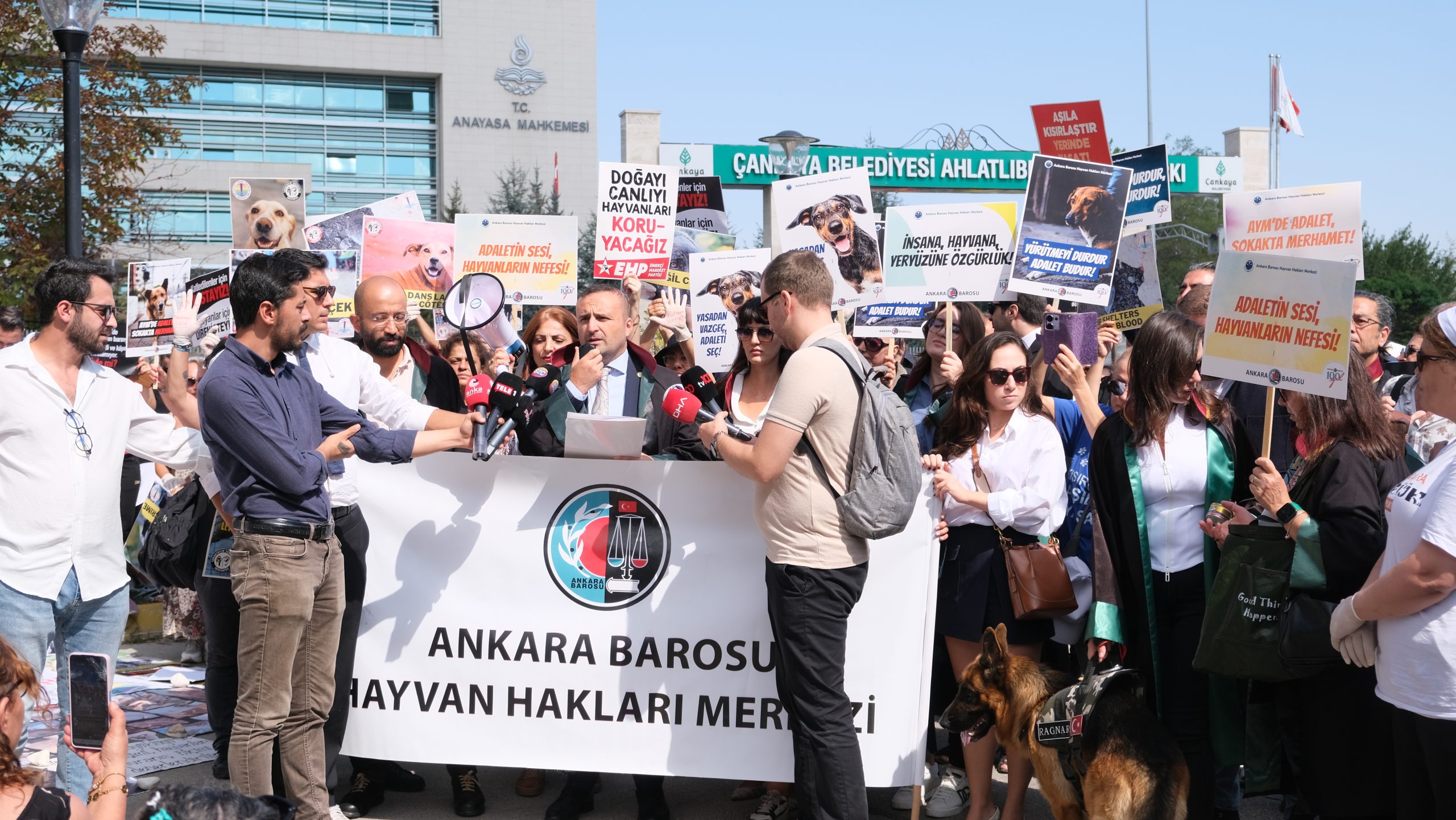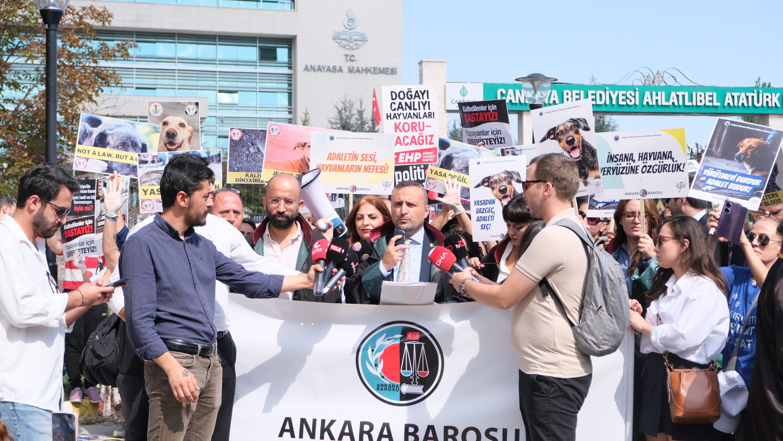 Ankara Barosu, “Hayvanları Koruma Kanunu’nda Değişiklik Yapılmasına Dair Kanun”un bazı hükümlerinin iptali ve yürürlüğünün durdurulması istemiyle açılan davanın ilk incelemesi sebebiyle AYM’nin önünde basın açıklaması yaptı.