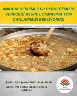 Ankara Dersimliler Derneği, 20 Ağustos Cumartesi, saat 18:00’de aşure lokması dağıtacak. Batıkent Pir Sultan Abdal Cemevinde dağıtılacak lokmalar için “Derneğimizin Aşure lokmasına tüm hemşehrilerimizi ve dostlarımızı bekliyoruz” denildi.