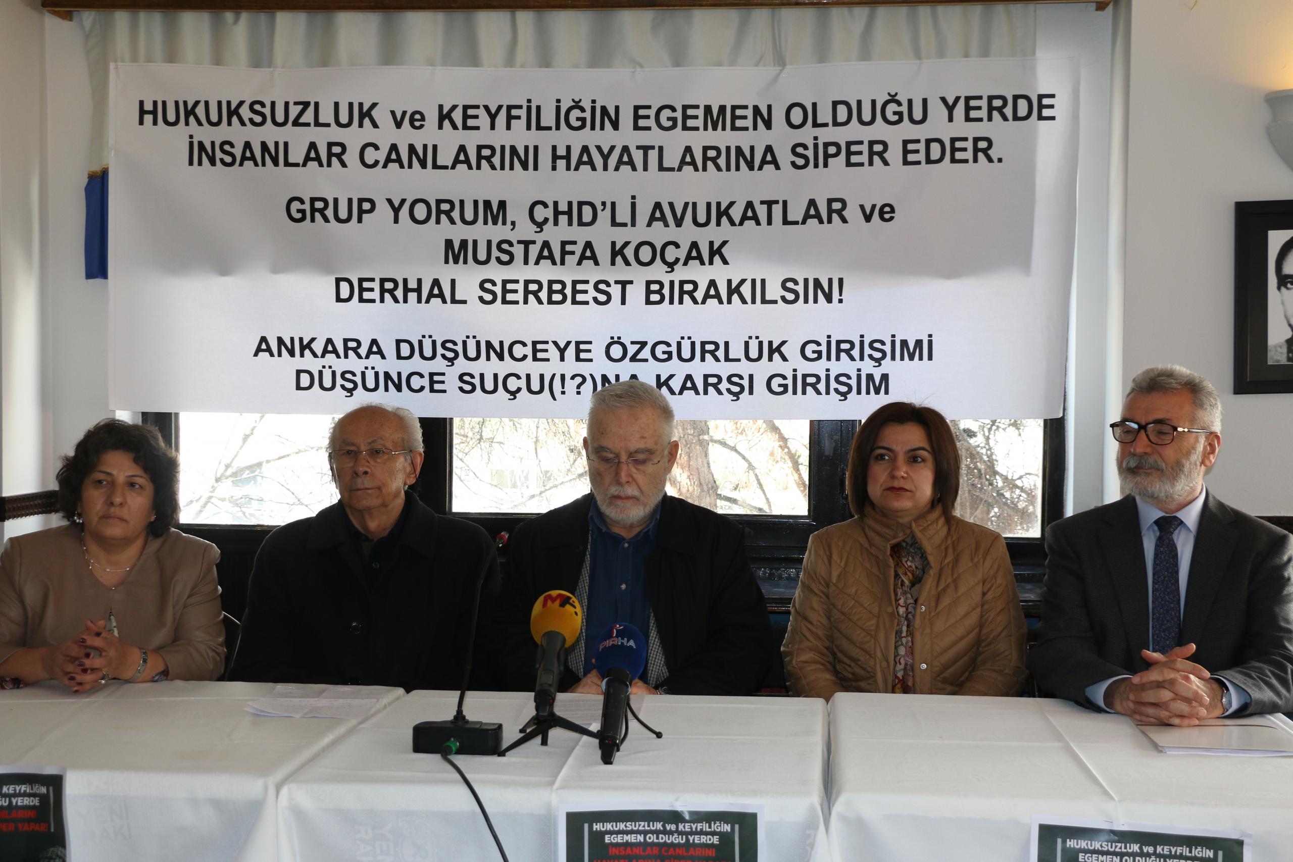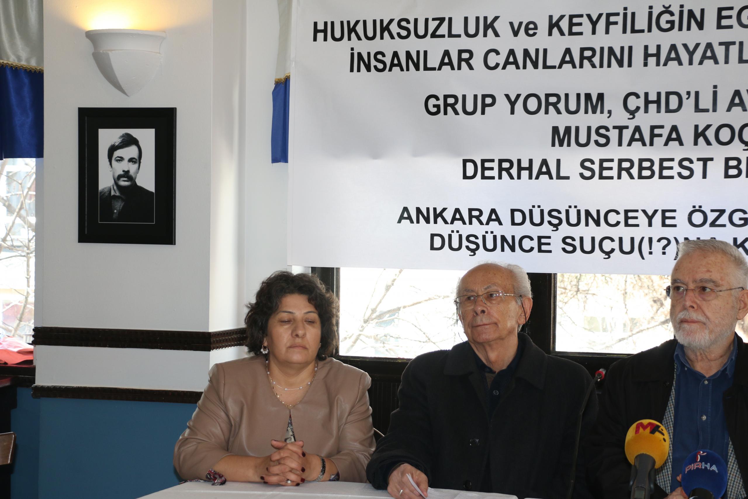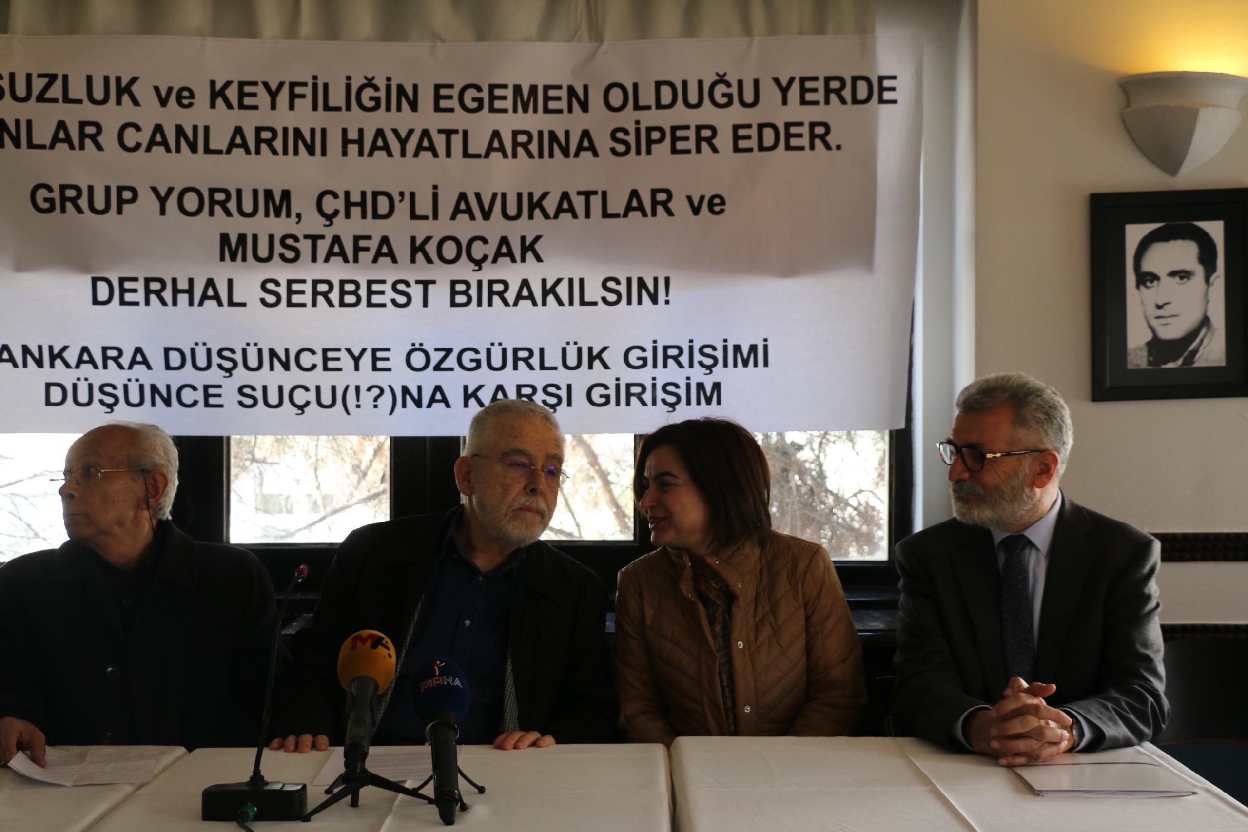 Konserlerinin yasaklanmasının ve baskıların kaldırılması için aylardır ölüm orucu eylemi yapan Grup Yorum üyeleri Helin Bölek ve İbrahim Gökçek ile ÇHD’li avukatların sürdürdüğü açlık grevindeki temel taleplerinin kabul edilmesi için bugün Ankara Düşünceye Özgürlük Girişimi bir basın toplantısı yaptı.