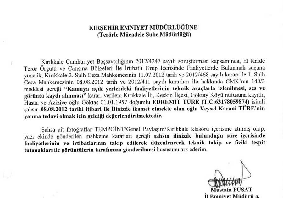 Bu Edremit Türe ile oğlu arasında tek irtibat değildi. Türe, oğlu ile konuştuktan sonra onun adına çıkarılan hattı kullanmaya başladı. Kırıkkale İl Emniyet Müdürlüğünün Kırıkkale Cumhuriyet Başsavcılığına 14 Haziran 2012 tarihinde yolladığı yazıya göre 13 Haziran günü Edremit Türe Kırıkkale’ye geldi. Öte yandan Hasan Tayip, çevre illerdeki örgüt üyelerine babasının geldiğini bildirdi. 14 Haziran günü X şahsı ile Hasan Tayip arasında şu diyalog geçti: