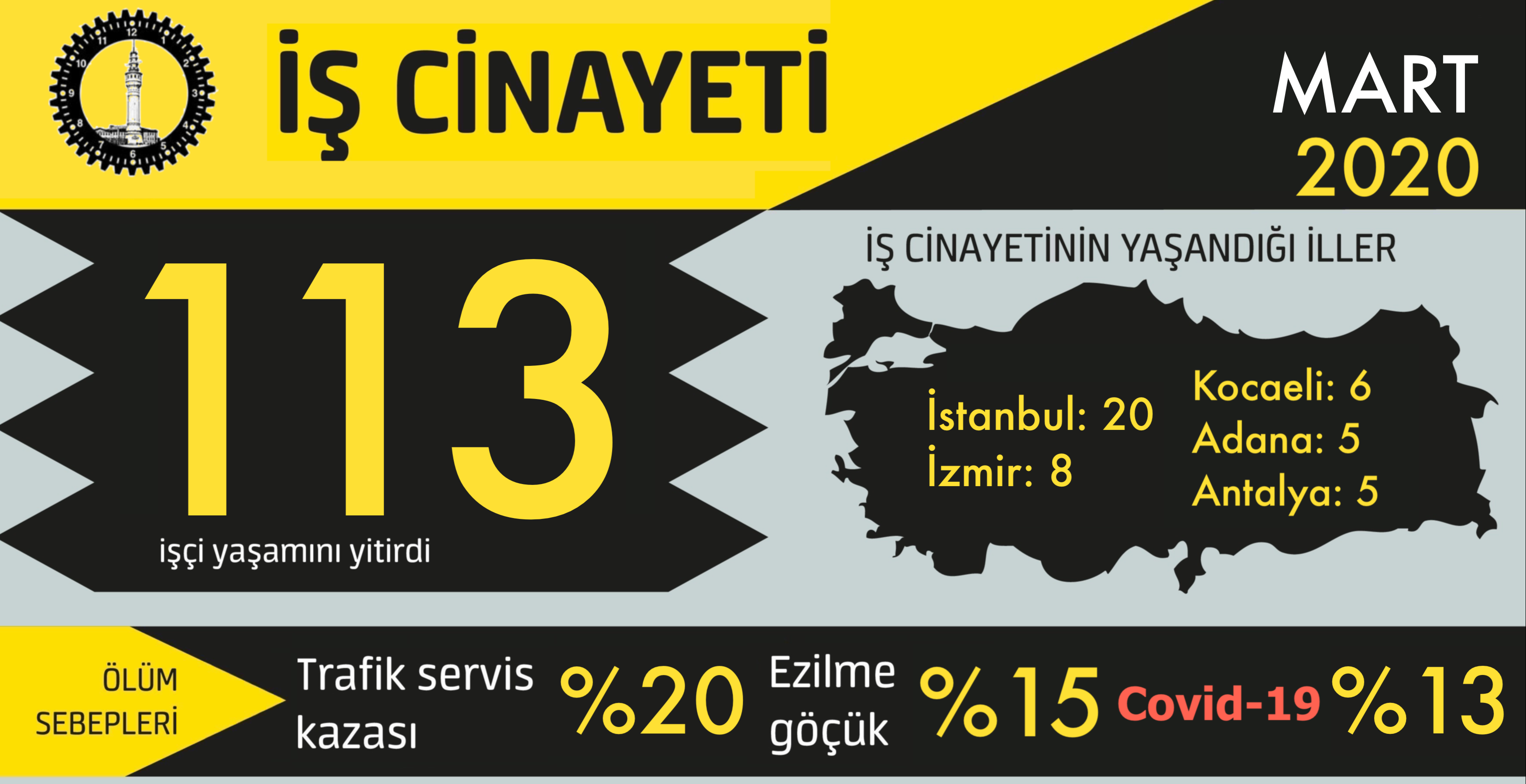 *14’ü koronavirüs nedeniyle olmak üzere Mart ayında en az 113 işçi yaşamını yitirdi.