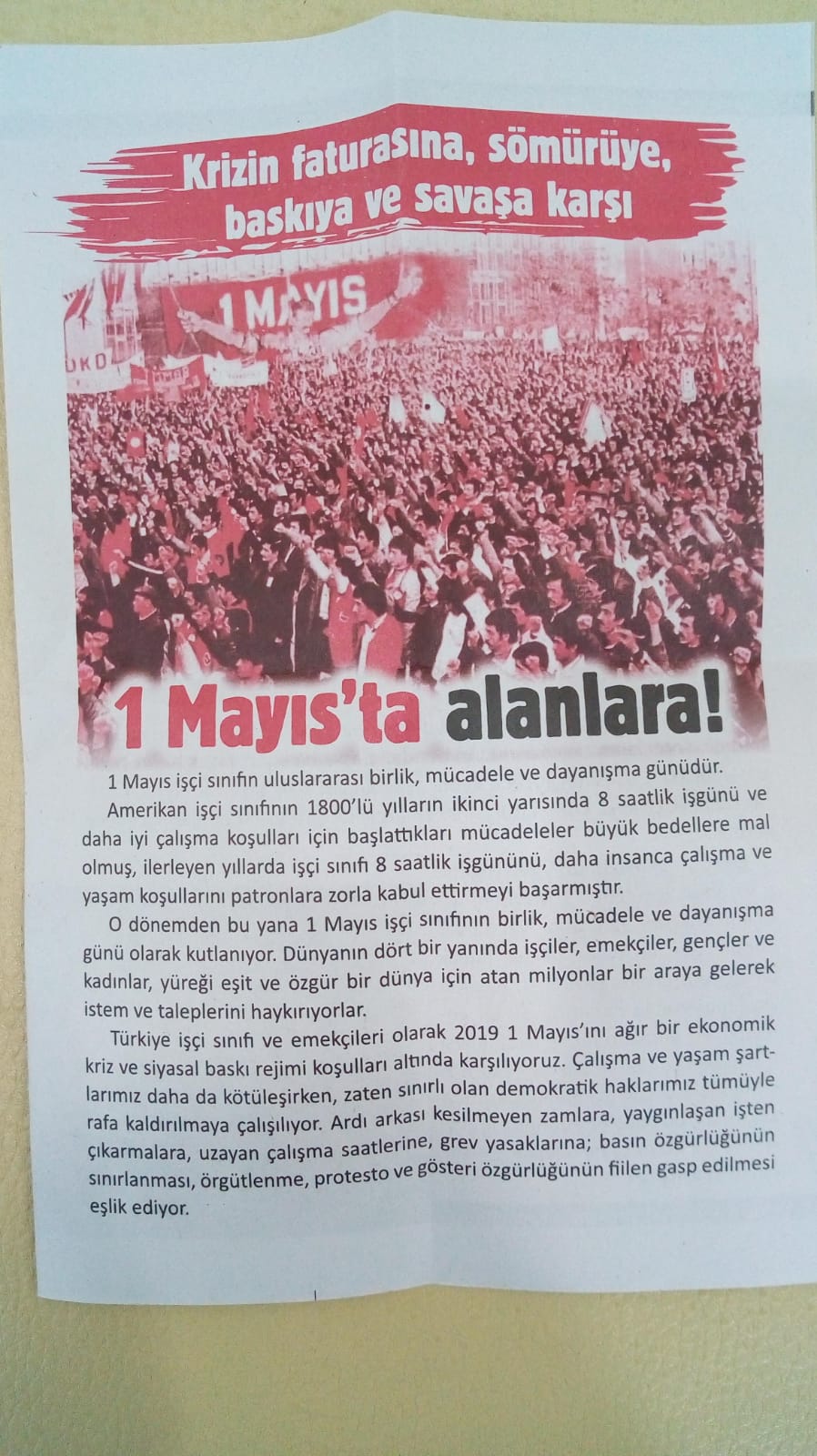 Ankara’da Mamak Natoyolu Tekmezar Parkı’nda 1 Mayıs bildirisi dağıtan Bağımsız Devrimci Sınıf Platformu üyesi Deniz Gündoğdu, Hasan Akman ile soyadları öğrenilemeyen Doğukan ve Songül adlı kişiler gözaltına alındı.