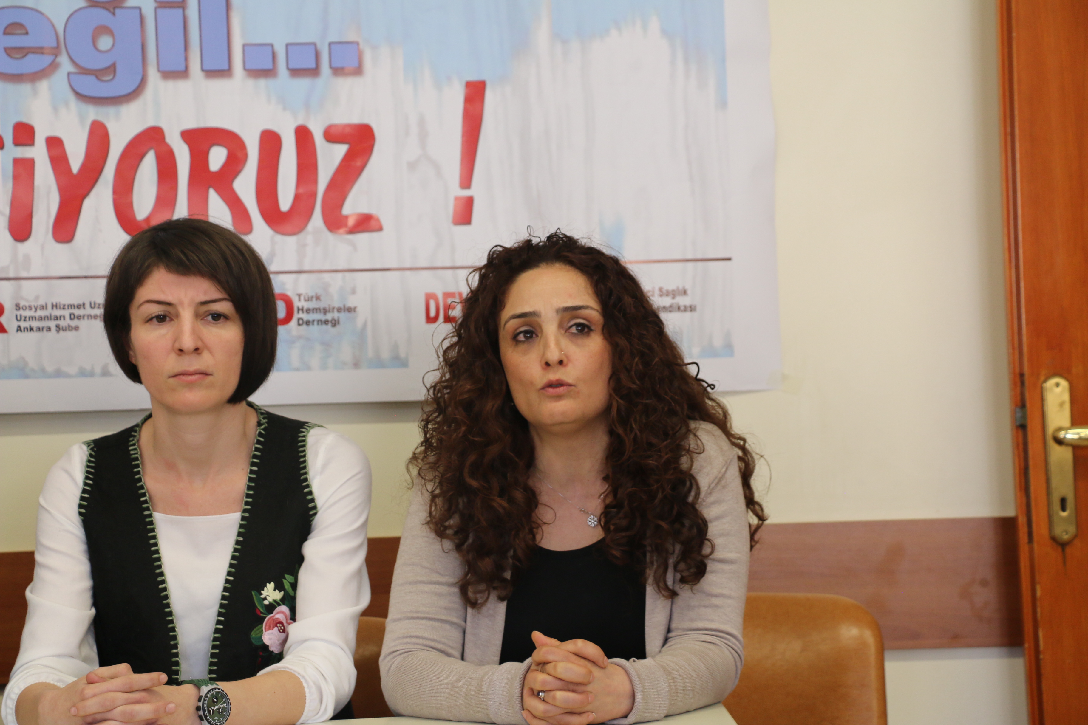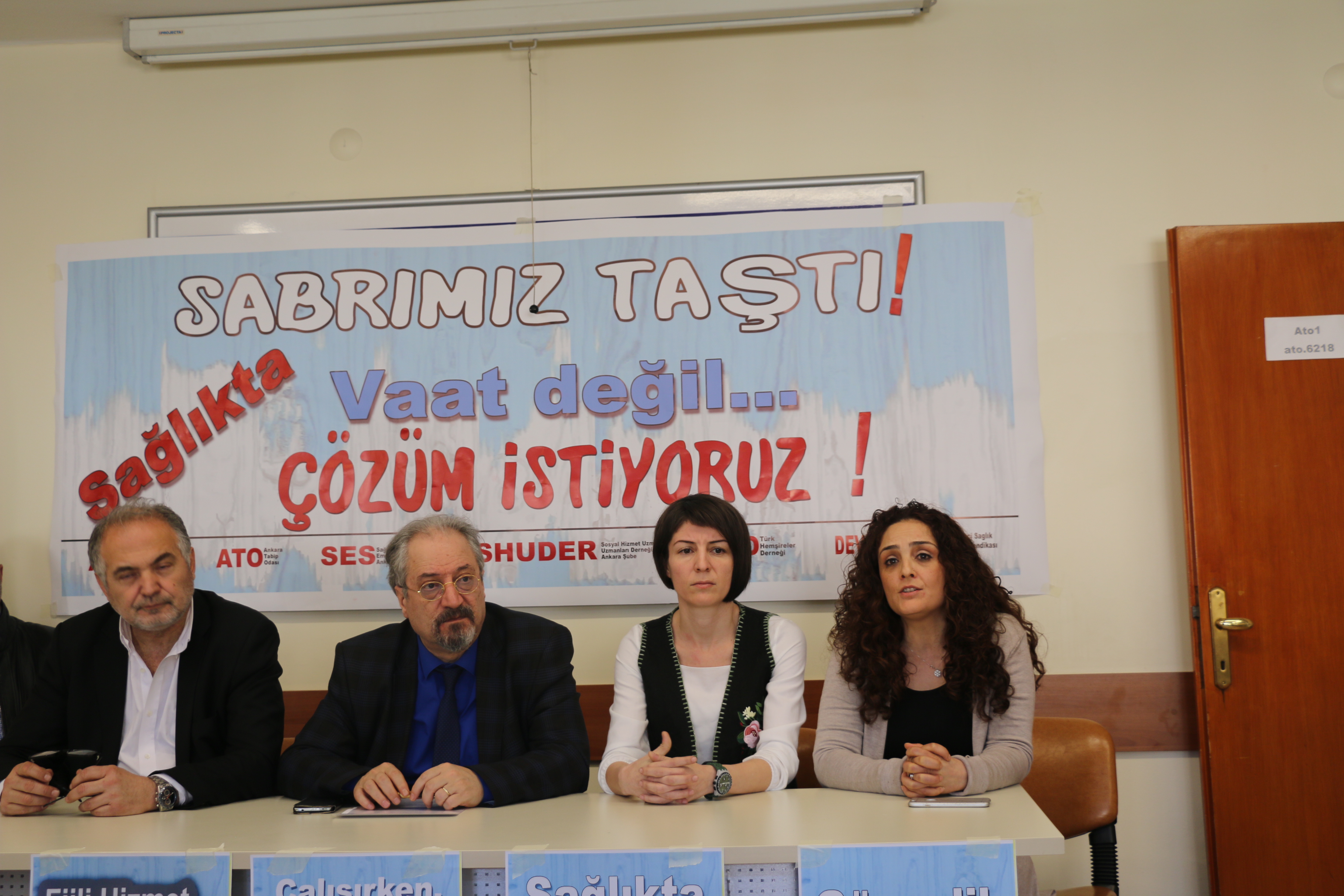 Bugün saat 12.30 da Ankara Numune hasta hanesi önünde Türk Hemşireler Derneği, Ankara Diş Hekimleri Odası, Sağlık ve Sosyal Hizmet Emekçileri Sendikası Ankara Şubesi, Devrimci Sağlık İş, Sosyal Hizmet Uzmanları Derneği, Ankara Tabip Odası ve sağlık örgütlerinin ortak yapmak istedikleri basın açıklamasına yönelik güvenlik güçlerinin plastik mermi ve gaz kullanılması ve gözaltına alınanlara ters kelepçe ile sert müdahalesine karşı ATO’da saat 14.30 da yapılan basın toplantısına TTB konsey üyesi, KESK Eş Genel Başkanı ve Ses Genel Eş Başkanı, KESK Ankara Şubeler Platformu dönem sözcüsü katıldı.