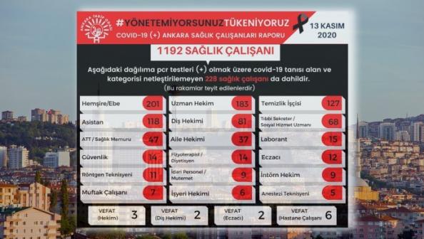 Ankara Tabip Odası, kentte Covid-19 testi pozitif çıkan sağlıkçı sayısının bin 192’ye yükseldiğini, 13 sağlıkçının yaşamını yitirdiğini açıkladı.