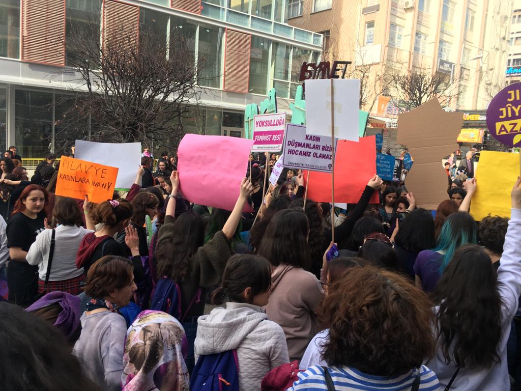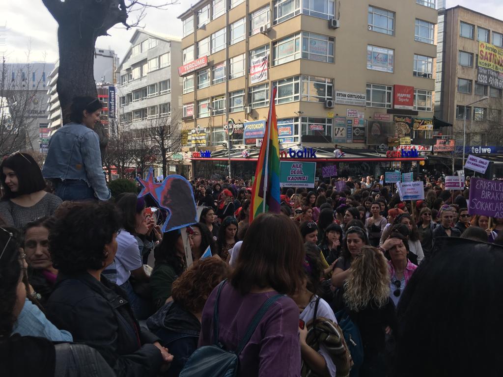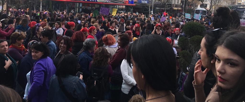 “Sen, ben, biz, özgürlük için altüst ederiz”, “Yaşamak istiyoruz” , “Kadınlara yönelik suçlarda iyi hal ve tahrik indirimine son”, “İster doğurur, ister doğurmam, kime ne, sana ne” dövizlerinin taşındığı eyleme yüzlerce kadın katıldı.