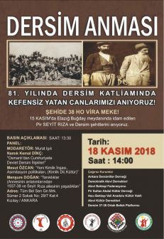 Ankara Dersimliler Derneği, Demokratik Alevi Dernekleri, Alevi Bektaşi Federasyonu, Pir Sultan Abdal Kültür Derneği, Hacı Bektaşi Veli Anadolu Kültür Vakfı, Alevi Kültür Dernekleri, Dersim 37-38 Ortak Bellek Platformu yaptıkları ortak çağrı ile 18 Kasım’da saat 13.30’da Tüm Bel-Sen Genel Merkezinde basın açıklaması gerçekleştirecek.