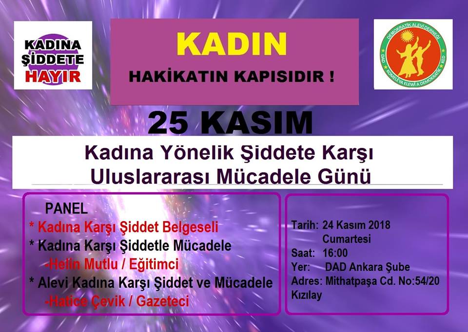 Ankara’da Kadına Şiddete Hayır ve Demokratik Alevi Derneği Ankara Şubesi 24 Kasım Cumartesi günü saat 16.00’da ‘Kadın hakikatın kapısıdır’ konulu panel düzenliyor.