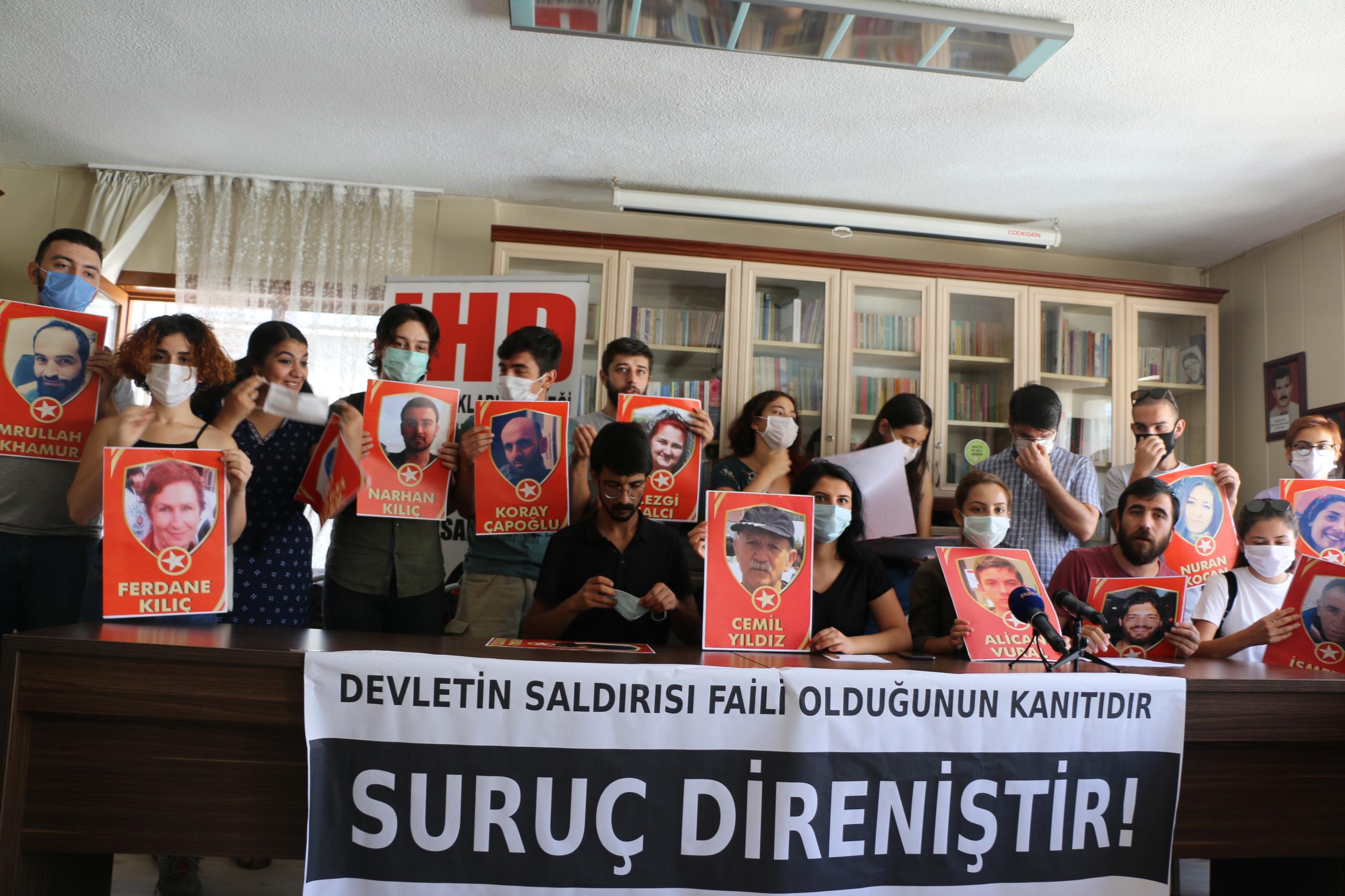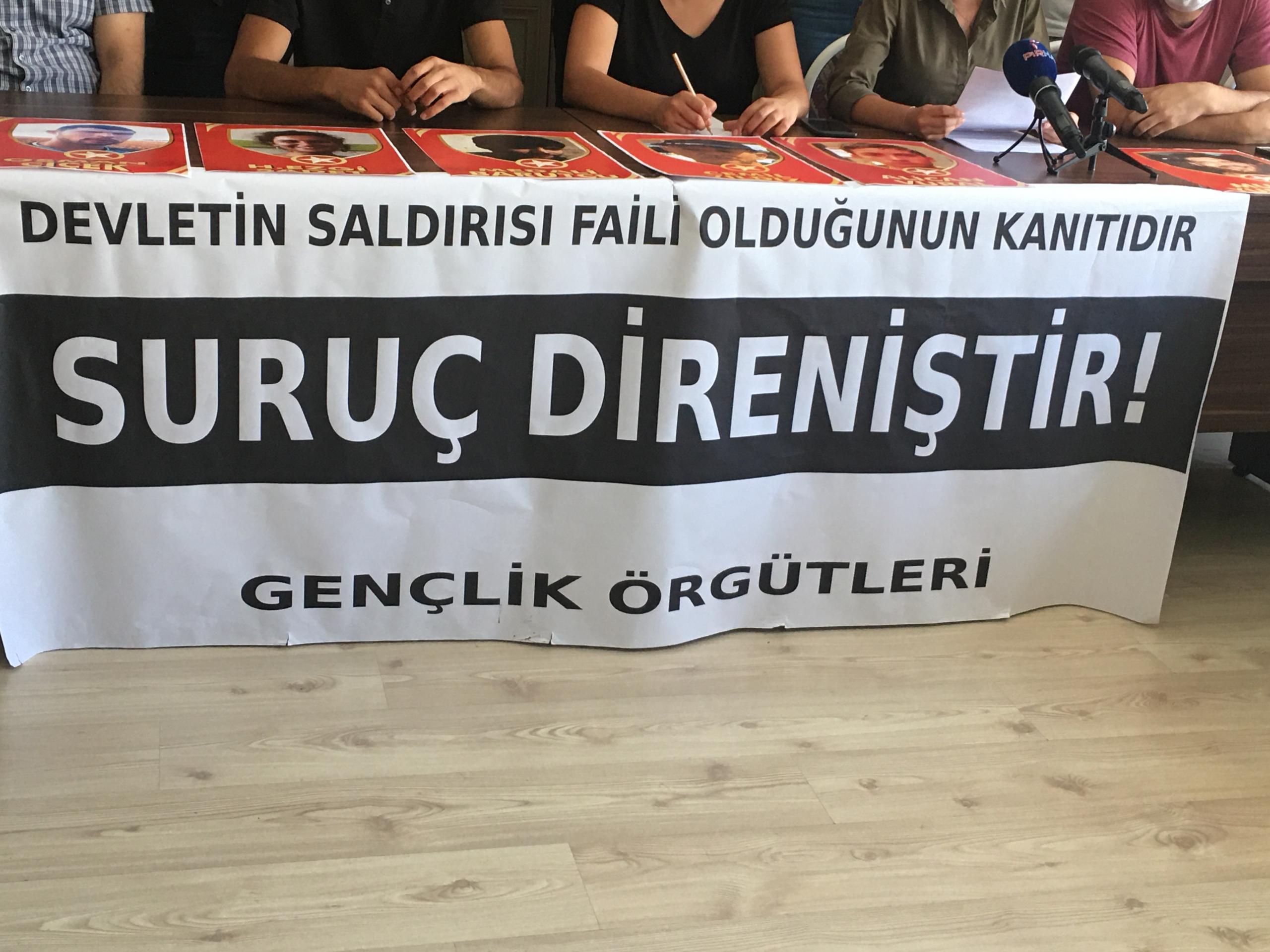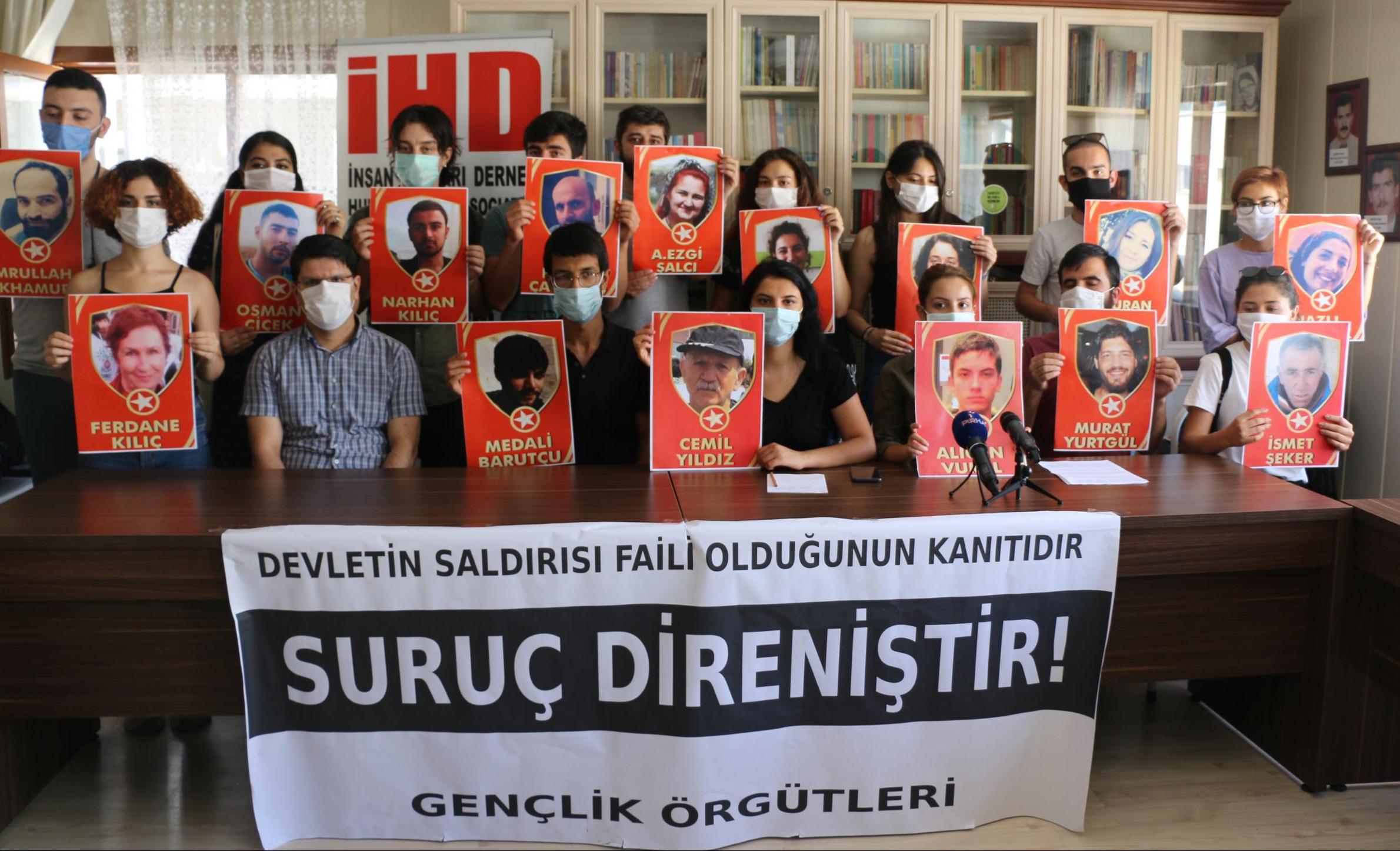 Ankara’daki gençlik örgütleri, Suruç katliamın 5’inci yıl dönümü dolayısıyla 20 Temmuz’da kentte yapmak istediği anmaya dönük gerçekleşen polis müdahalesine ilişkin basın toplantısı yaptı. İnsan Hakları Derneği (İHD) Genel Merkezi’nde yapılan açıklamaya Suruç Katliamında yaşamını yitiren 33 kişinin fotoğrafları açıldı.