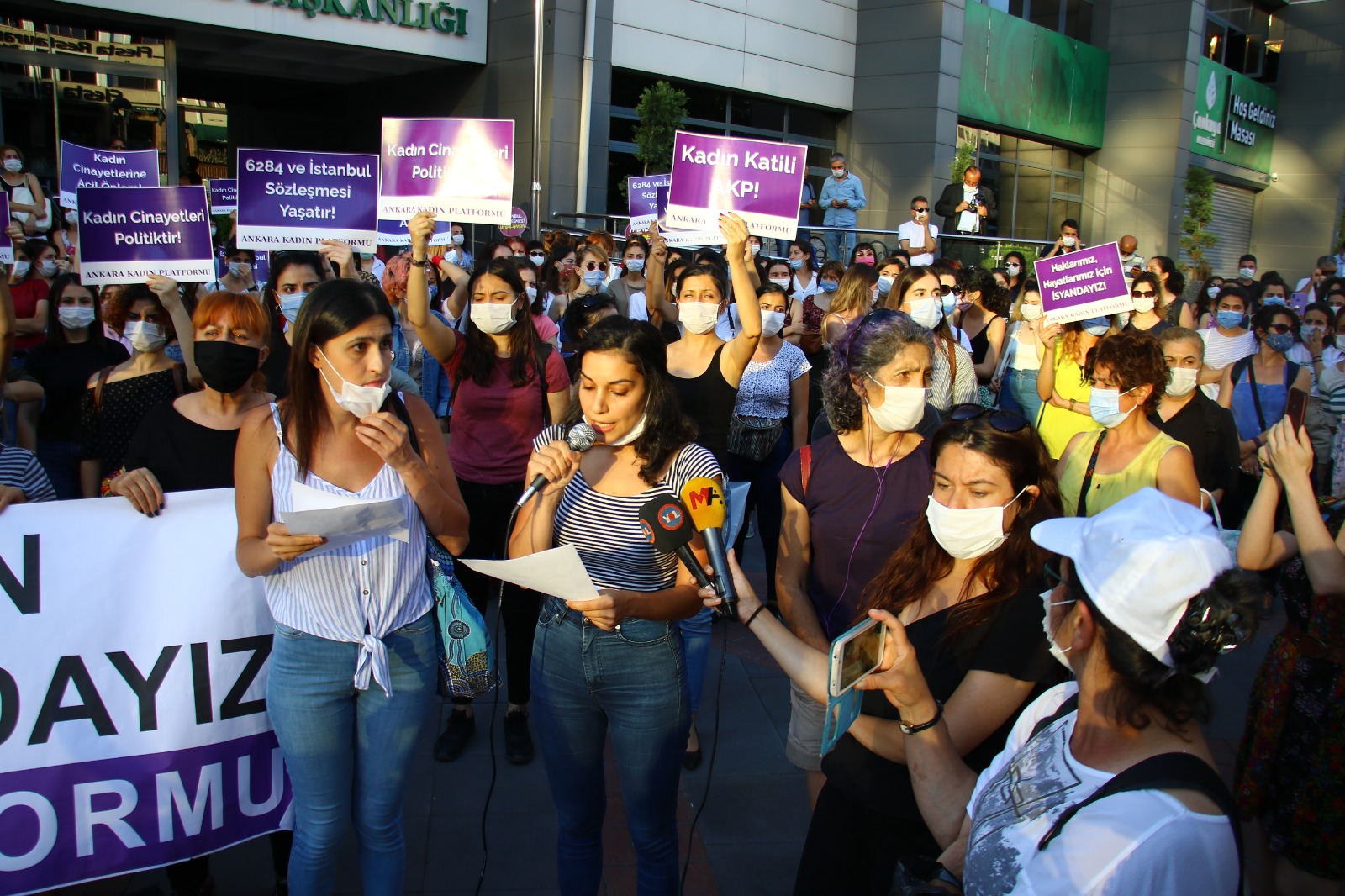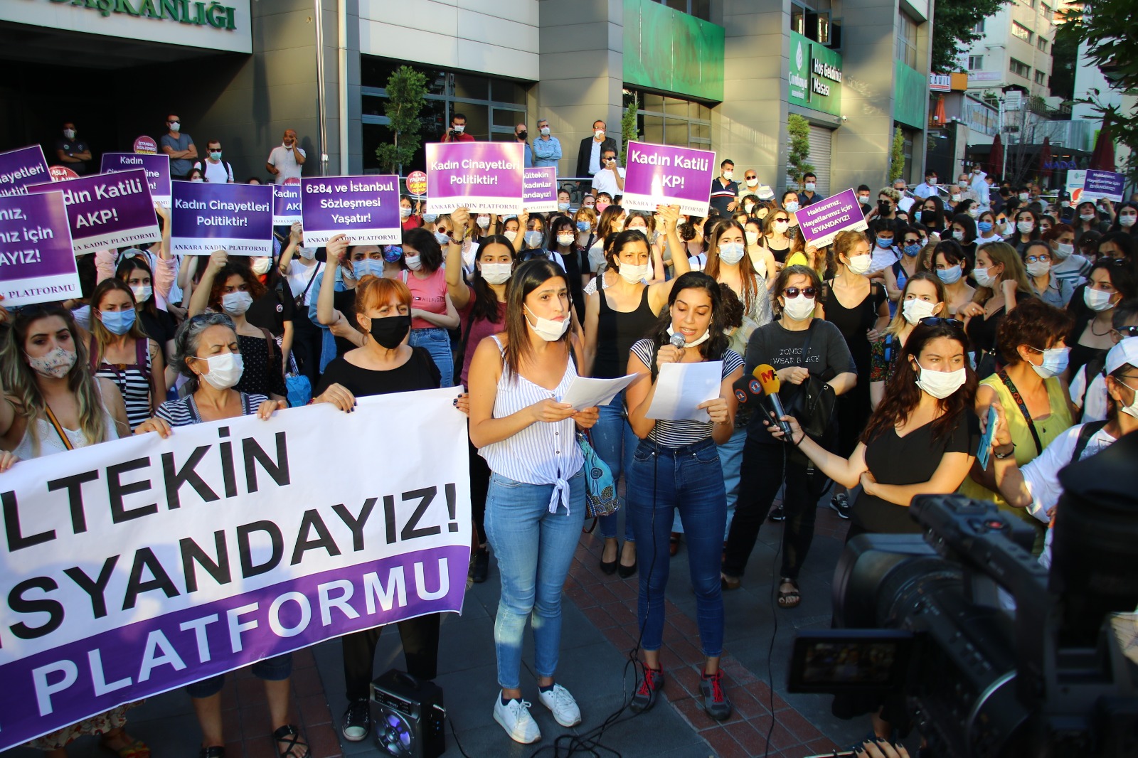 Ziya Gökalp Caddesi üzerinde bulunan Çankaya Belediyesi önünde bir araya gelen binlerce kadın Gültekin’in katledilmesini kınadı. Açıklama öncesi polislerin geniş güvenlik önlemleri alması ve çevrede durakta otobüs bekleyen yurttaşları alandan uzaklaştırması dikkat çekti. Polisin açıklama esnasında haber takibi yapan gazetecilerden sık sık basın kartı istemesi ve çekim yapmalarını engellemesi kadınların tepkisine neden oldu.
