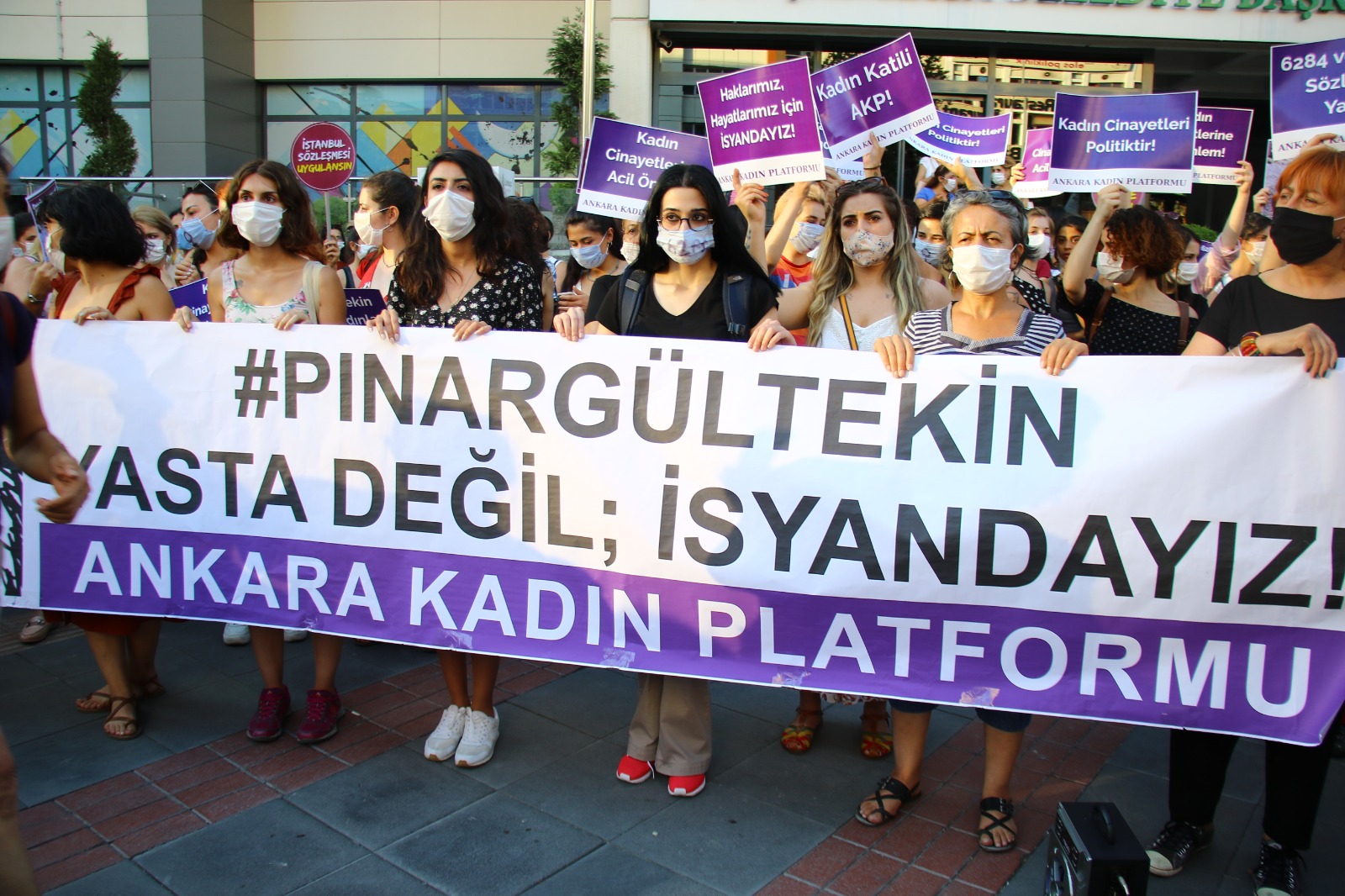 “#PınarGültekin Yasta değil; İsyandayız” pankartı ve “Kadın cinayetlerine acil önlem, Kadın cinayetleri politiktir, 6284 ve İstanbul Sözleşmesi yaşatır, Kadın katili AKP” dövizleri açıldı.