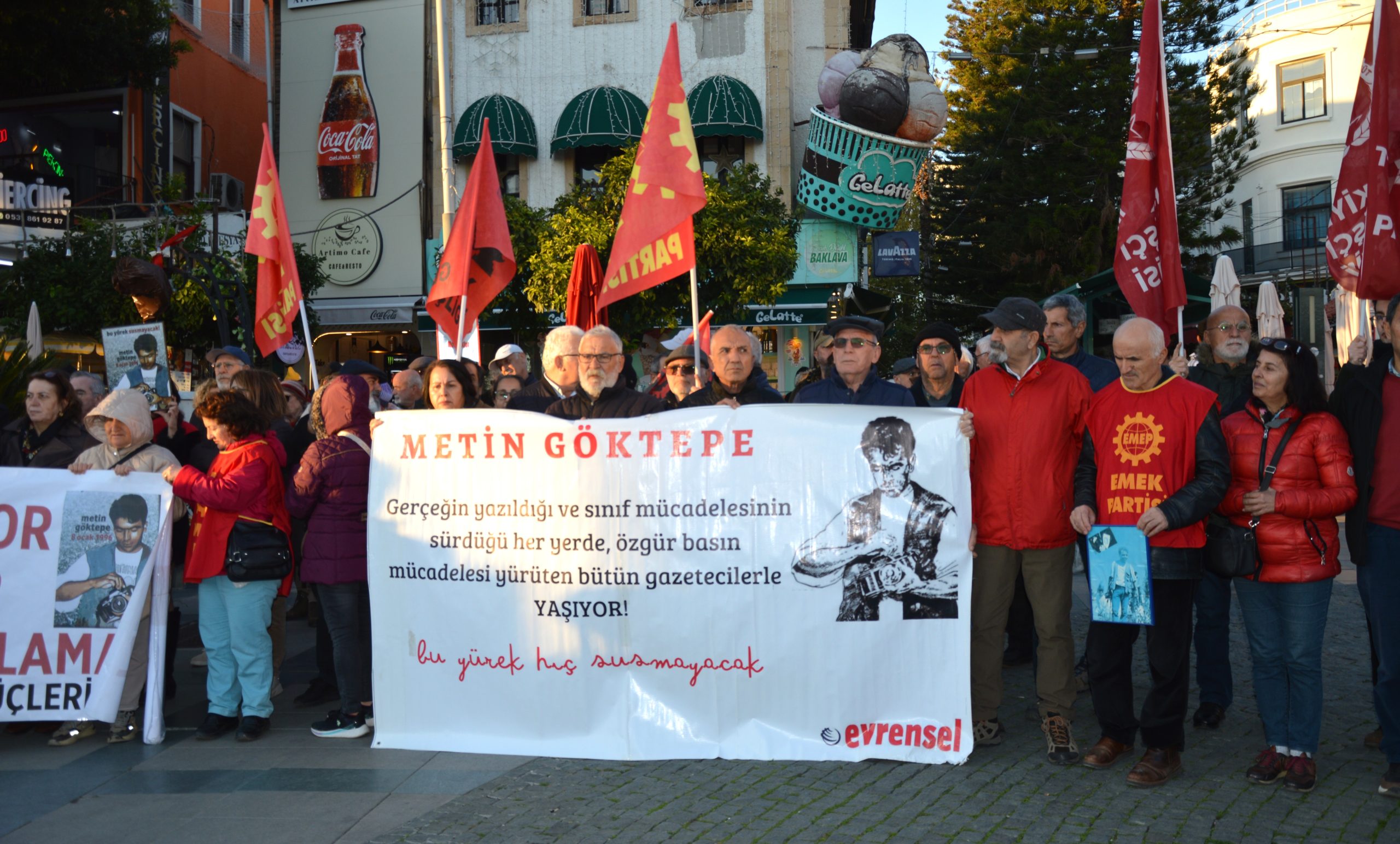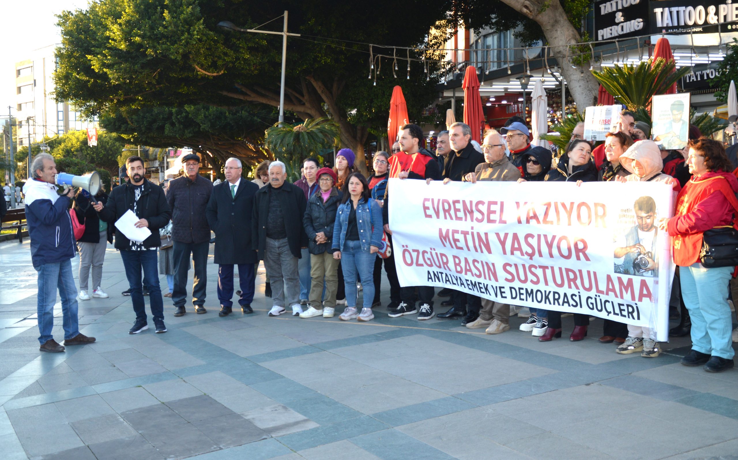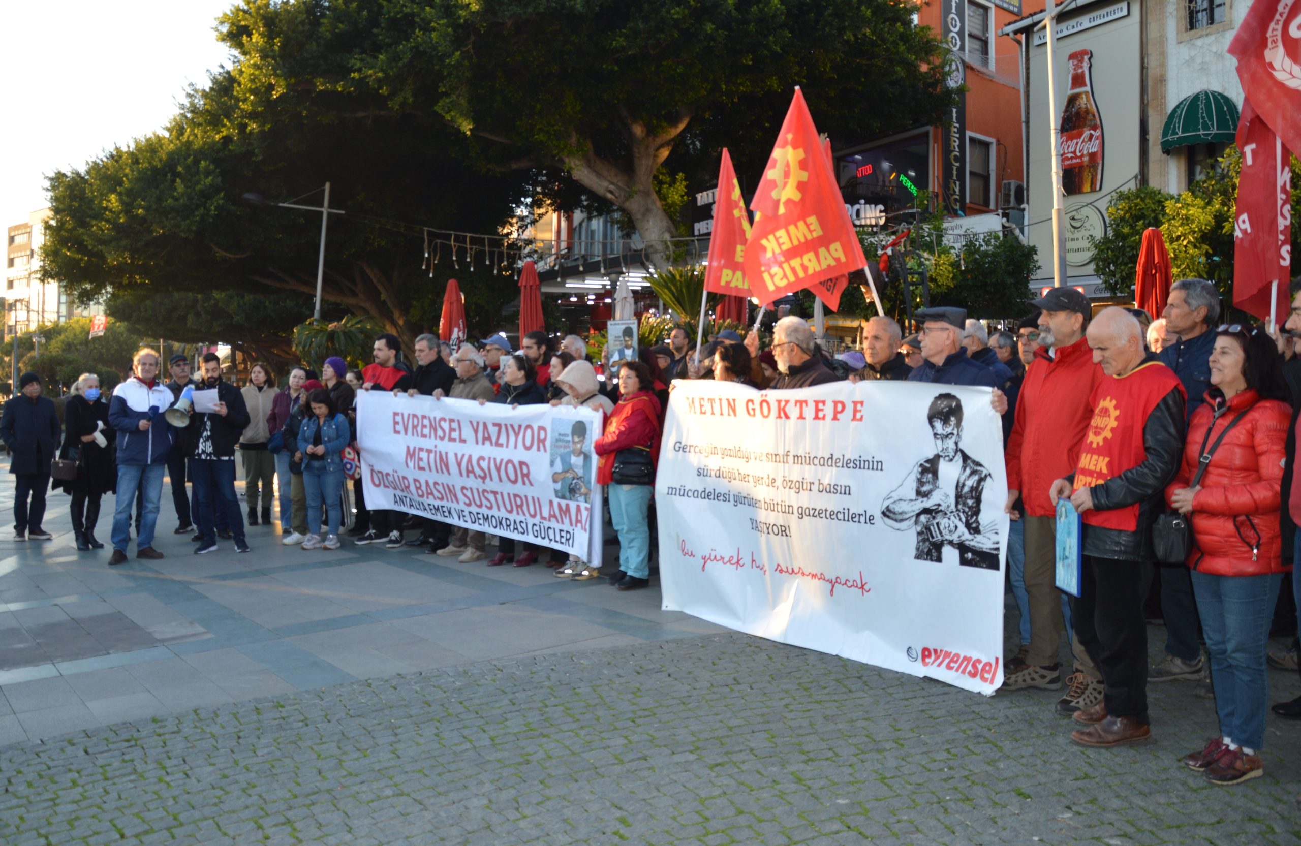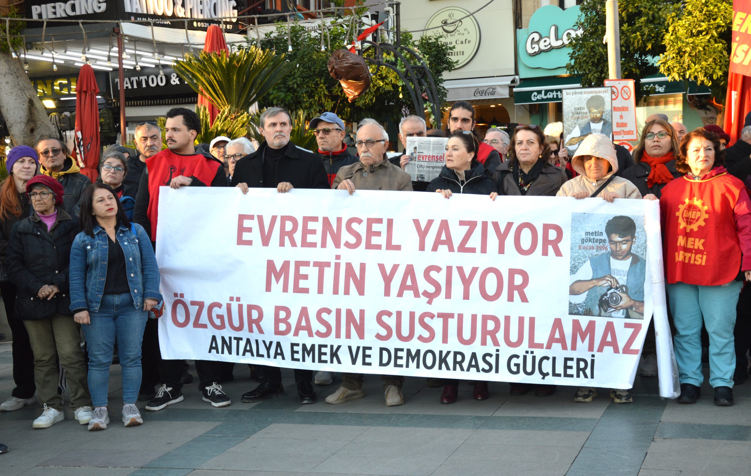Gazeteci Metin Göktepe’nin 8 Ocak 1996’da polisler tarafından dövülerek katledilmesinin yıldönümünde Antalya Emek ve Demokrasi Güçleri tarafından basın açıklaması yapıldı. Açıklamayı Evrensel Gazetesi adına Salih Aksoy okudu.