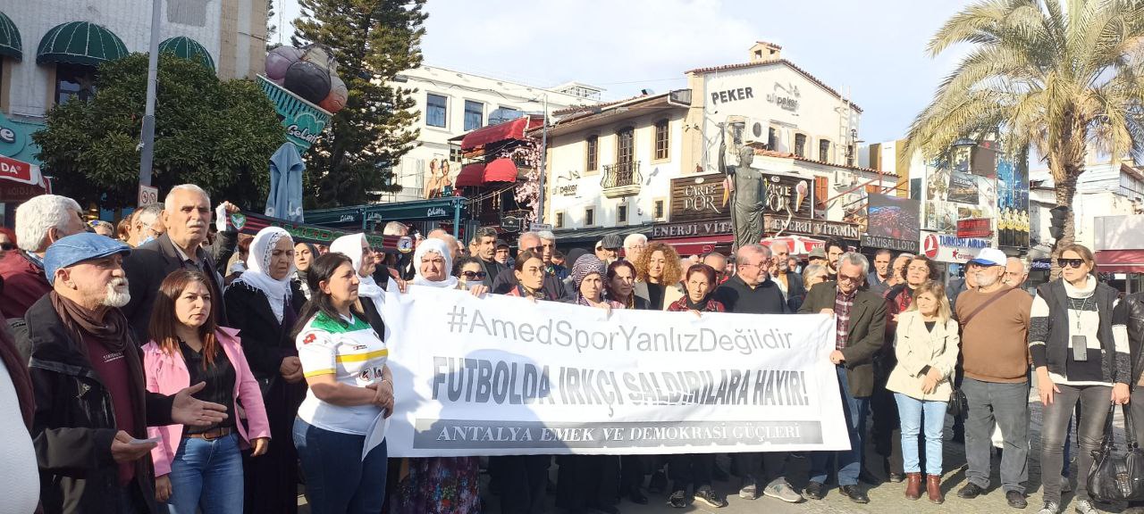Antalya Emek ve Demokrasi Platformu, Bursa’da Amedspor’a yönelik ırkçı saldırıya ilişkin basın açıklaması yaptı. Açıklamayı platform adına Antalya HDP İl Eşbaşkanı Hülya Haspay okudu, açıklamaya HDP Antalya Milletvekili Kemal Bülbül de katıldı. Açıklamada, ‘Amedspor yalnız değildir’ ve ‘Futbolda ırkçı saldırılara hayır’ pankartı açıldı.