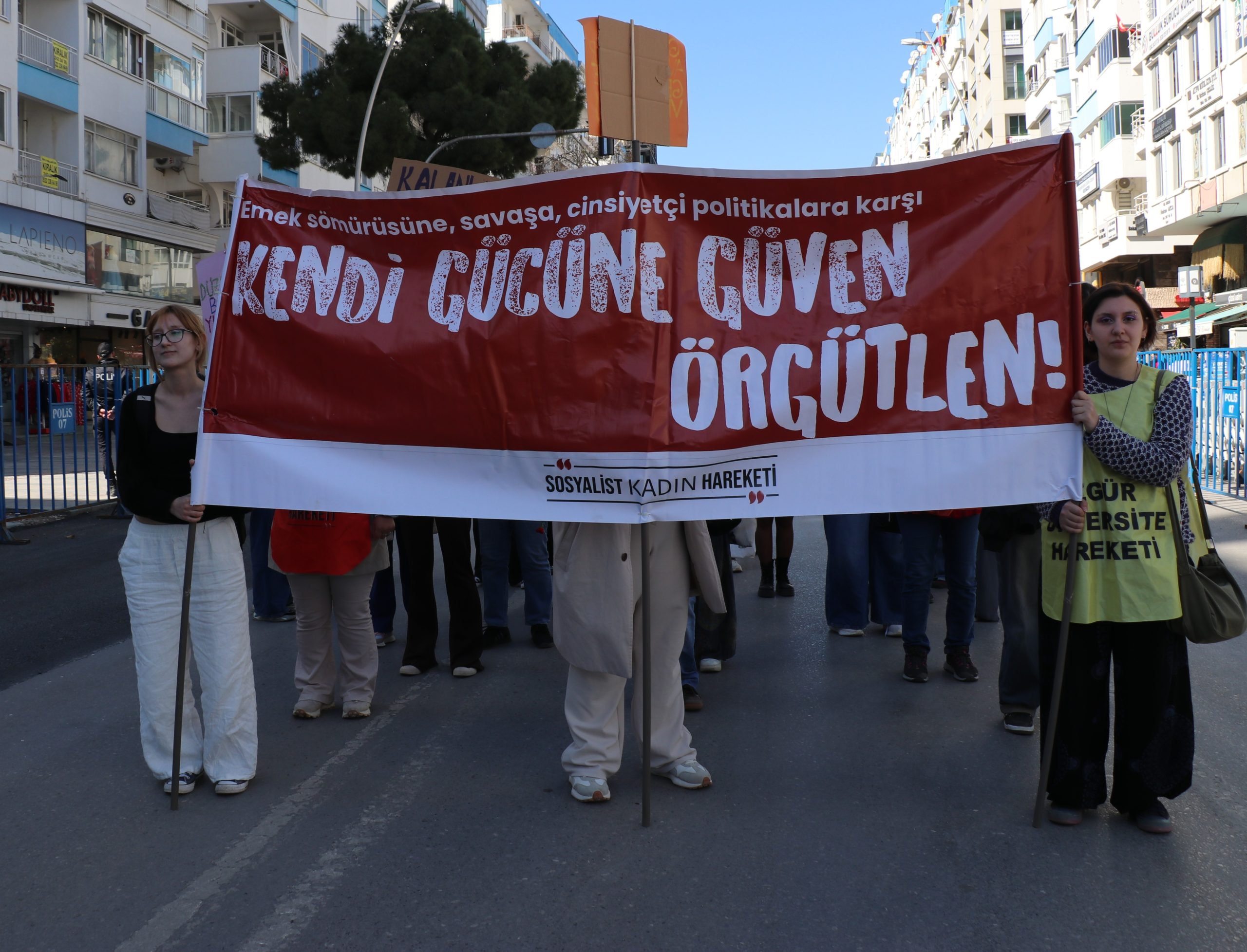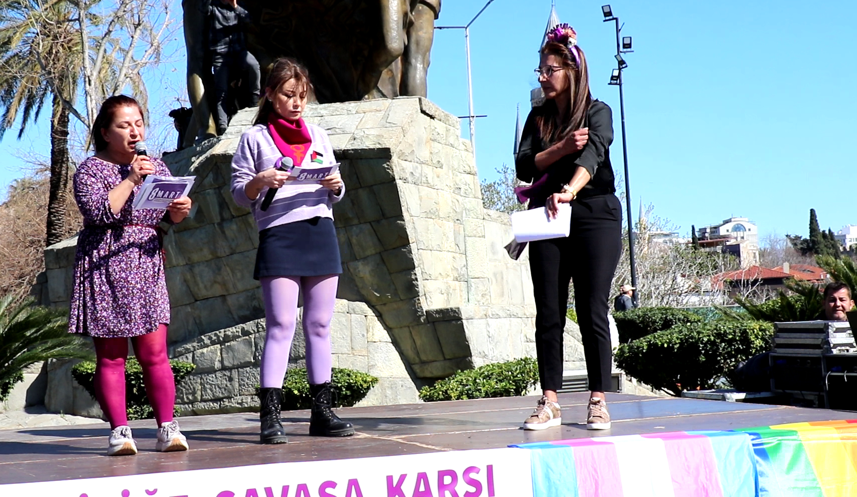 Kadınlar, yüzyıllardır bastırılmak, susturulmak istenen seslerini haykırmaya geldiklerini belirterek, “Bu düzen bizim emeğimizle ayakta duruyor ama bize yoksulluk reva görülüyor. Bu düzen bizim sırtımızdan yükseliyor ama bize şiddet, güvencesizlik ve korku dayatılıyor. Buradayız ve bu meydan emeği sömürülen, hakkı gasp edilen, yaşamı tehdit altında olan kadınların meydanıdır! Bu meydan haklarına hayatlarına sahip çıkan, vardık, varız var olacağız diyen kadınların meydanıdır! Bizi yok sayanlara karşı inatla buradayız!” dedi.