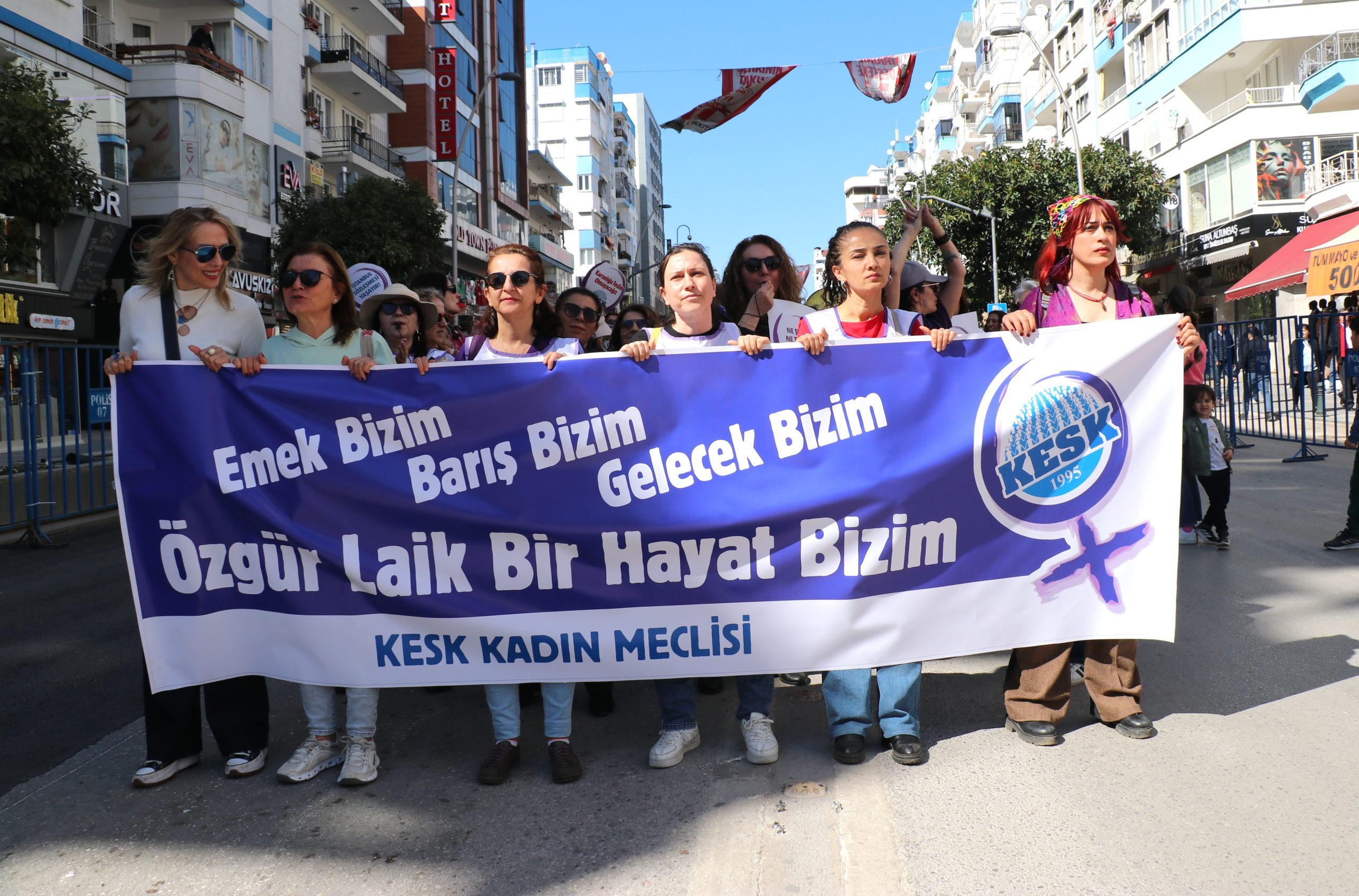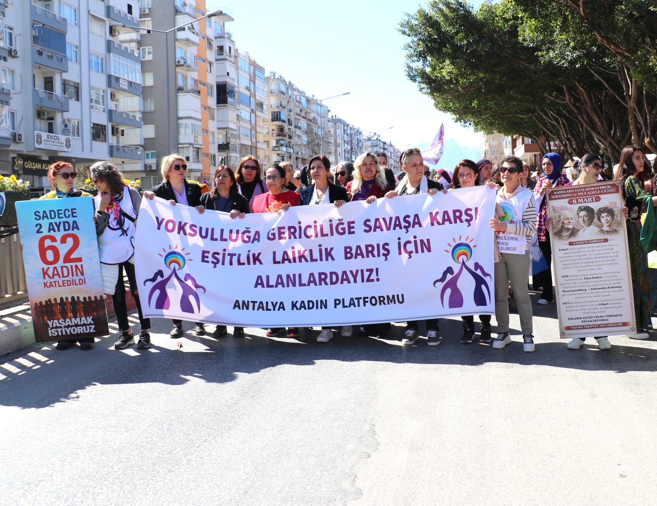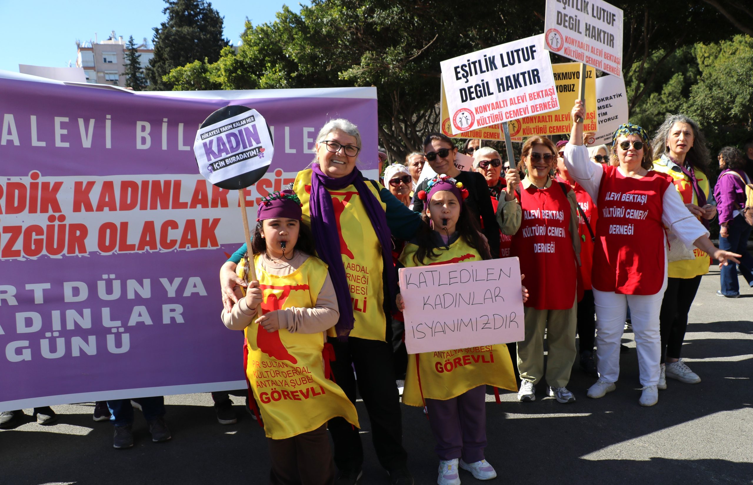 Kadınlar Türkiye ve dünyanın bir çok merkezinde hakları için sokaklara, meydanlara çıktı. Antalya’da Aydın Anza Parkında biaraya gelen kadınlar kortejler eşliğinde kadınlar Cumhuriyet Meydanı’nda yürüyüş gerçekleştirdi