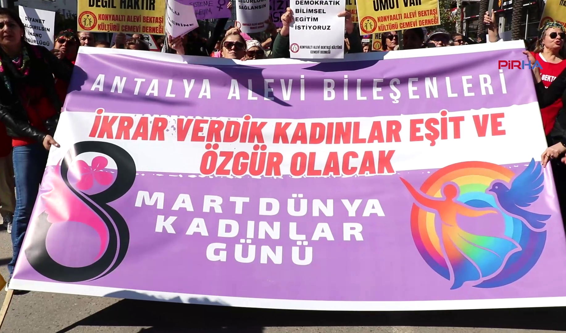PİRHA- Antalya’da kadınlar, 8 Mart Dünya Kadınlar Günü’nü kutladı. Meydanları dolduran kadınlar, “Haklarımızı, kazanımlarımızı, sokakları bizden almak isteyenlere karşı buradayız. Kadın cinayetlerine, erkek şiddetine, aile politikalarına, güvencesizliğe cezasızlık politikalarına karşı sokaktayız. Hayatlarımızdan, birbirimizden, özgürlüğümüzden vazgeçmiyoruz. Baskılarla, şiddetle hayatlarımızı teslim almaya çalışanlara karşı susmuyoruz, sokakları terk etmiyoruz” dedi.