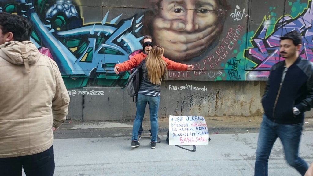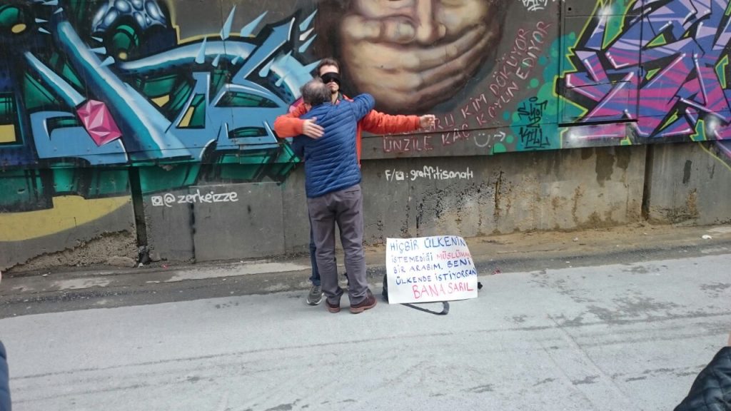 PİRHA-İstiklal Caddesi’nden geçen insanların dikkatini üzerine çeken genç mülteciye önce anlamsız gözlerle bakanlar, yanındaki “Hiçbir ülkenin istemediği Müslüman bir Arabım. Beni ülkende istiyorsan bana sarıl” yazısını okuduktan sonra peş peşe gidip ona sarılıyorlar.