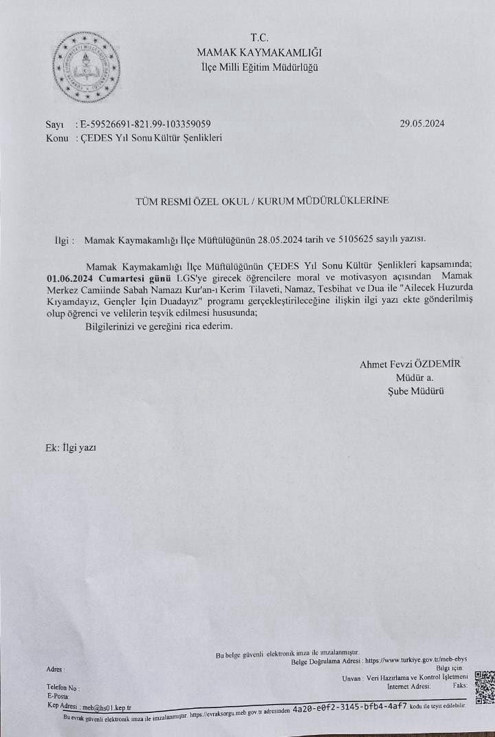 Mamak Kaymakamlığı’na bağlı İlçe Müftülüğü, İlçe Milli Eğitim Müdürlüğü’ne yazı göndererek, ÇEDES Yıl Sonu Kültür Şenlikleri kapsamında düzenlenecek etkinliklere LGS’ye girecek öğrenciler ve velilerinin çağrılmasını istedi.