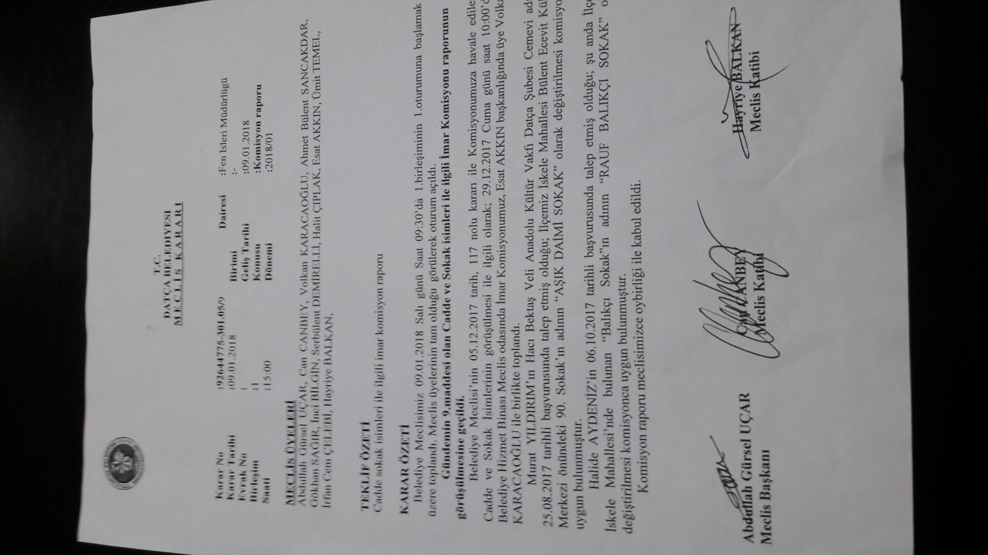 Datça Belediye Meclisi’nin 05 Aralık 2017 tarih, 117 nolu kararı ile Komisyona havale edilen Cadde ve Sokak İsimlerinin görüşülmesi ile ilgili olarak; 29 Aralık 2017 Cuma günü 29.12.2017 Cuma günü konuyla ilgili toplantı yapıldı.