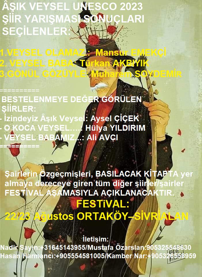 Aşık Veysel UNESCO 2023 Şiir Yarışması’nda 1. şiir Mansur Emekçi’ye ait “VEYSEL OLAMAZ” adlı eser oldu.