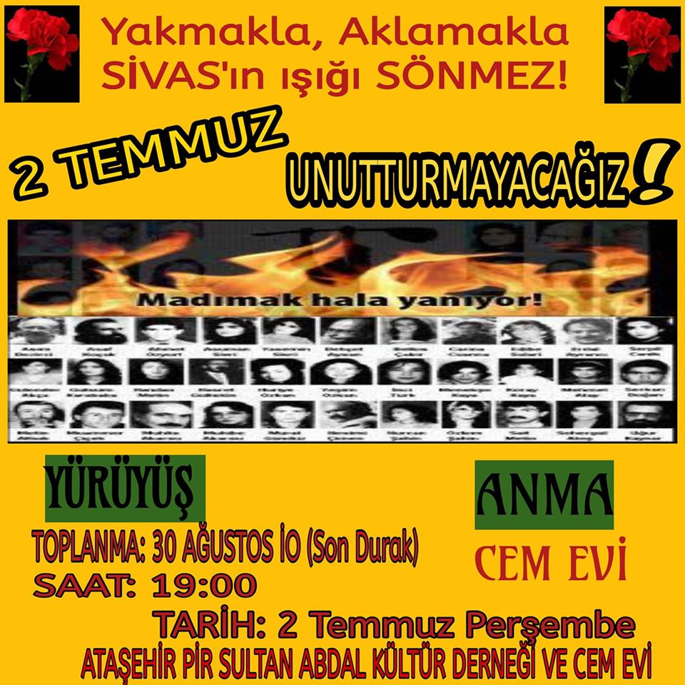 Pir Sultan Abdal Kültür Derneği Ataşehir Şubesi ve Cemevi, Sivas Katliamı’nda yaşamını yitirenleri anmak için 2 Temmuz Perşembe günü saat 19.00’da yürüyüş ve cemevinde anma gerçekleştirecek.