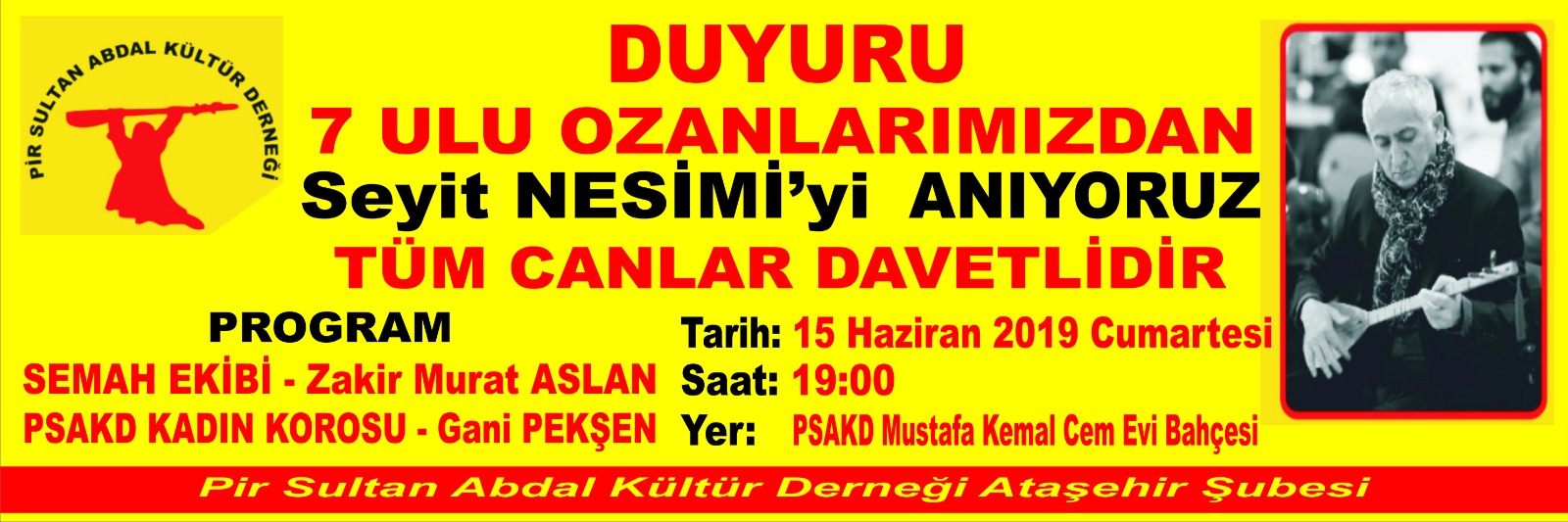 PİRHA- PSAKD Ataşehir Şubesi, 15 Haziran Cumartesi günü 3. Bahar Şenliğini gerçekleştirecek. Bu yılki şenlikte 7 ulu ozandan Seyit Nesimi anılacak.