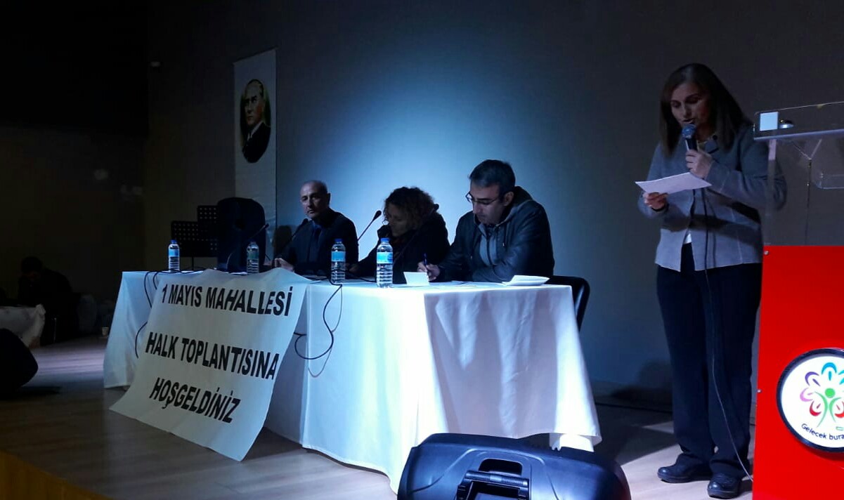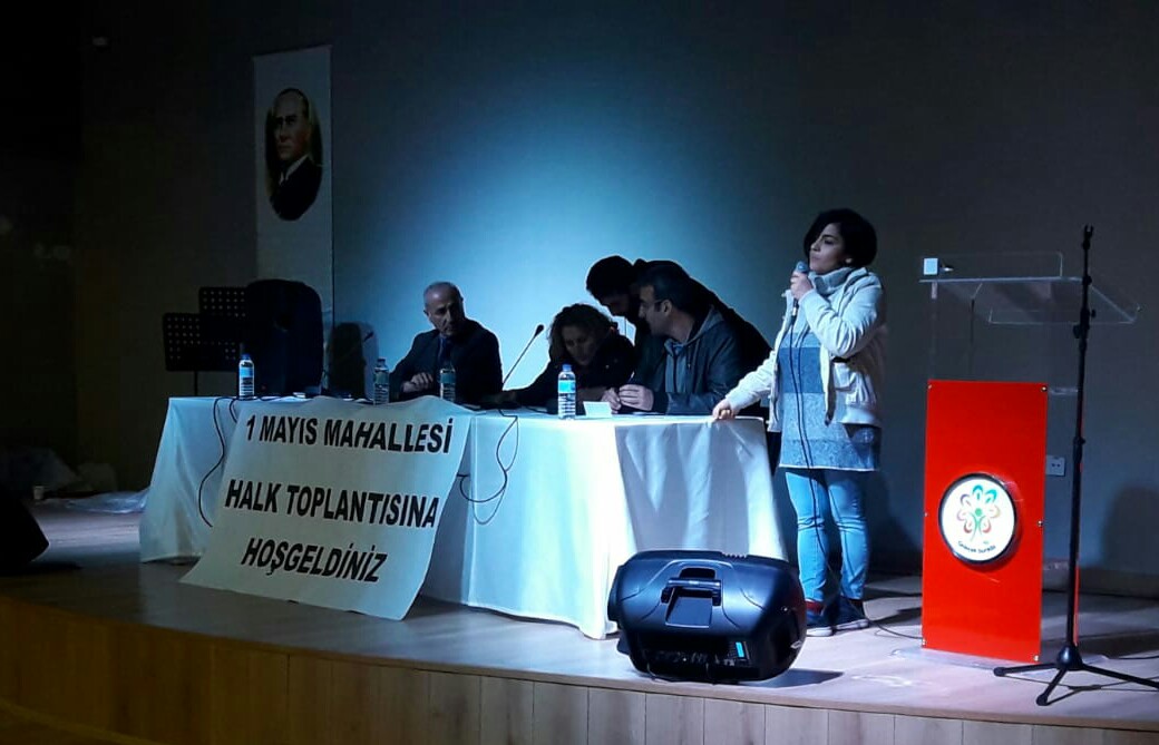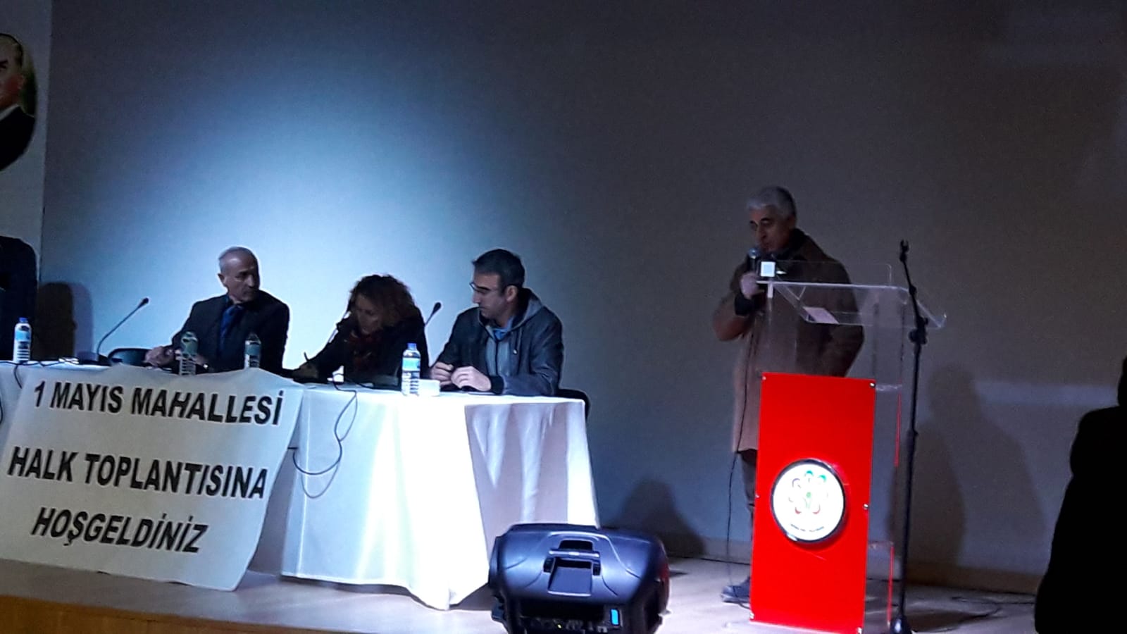 “Sevgili 1 Mayıs halkı, çoğunuz 70’li yıllarda ailelerinize ve çocuklarınıza daha insanca yaşam koşulları için yurdun dört bir yanından kentlere geldiniz. Buralarda gecekondu mahalleleri kurdunuz. Zor koşullarda başınızı koyacak evler yapıp yıllarca vergilerinizi, elektrik, su, alt yapı masraflarını ödeyip tapularınızı da aldınız. Ancak kentlerdeki rantçı sistem nedeniyle, başta mahallemiz olmak üzere yoksul halklarımızın evleri kentsel dönüşüm projeleri gerekçeleriyle ellerinden alınmak isteniyor. Sizleri, acılar, gözyaşı ve bedeller ödeyerek edindiğiniz evlerinizden atmak ve yüksek rantlar elde etmek istiyorlar.”