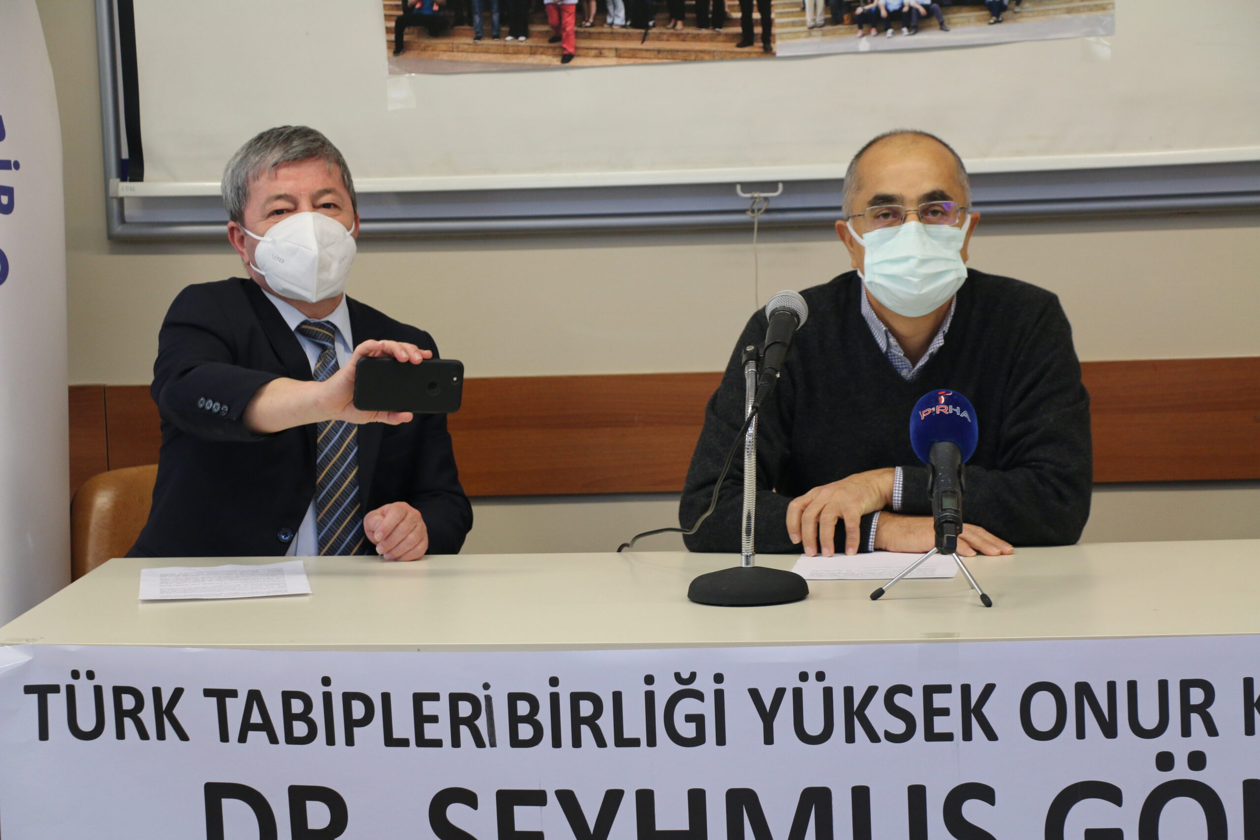 “Dr. Şeyhmus Gökalp derhal serbest bırakılsın” pankartının asıldığı basın toplantısına TTB yönetimi de destek verdi.