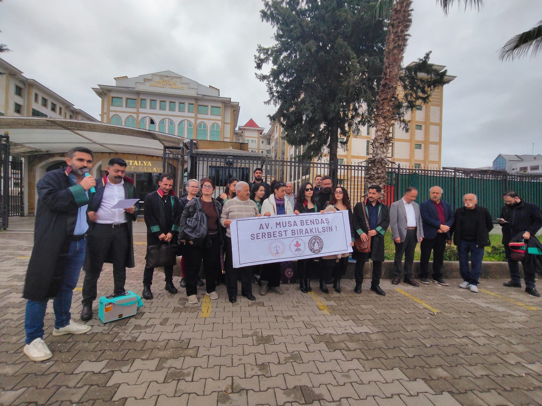 Antalya’da Avukat Musa Bendaş’ın meslektaşları Antalya Adliyesi önünde bir araya geldi. Yapılan ortak açıklamada, “Avukat Musa Bendaş Serbest Bırakılsın” pankartı açıldı.