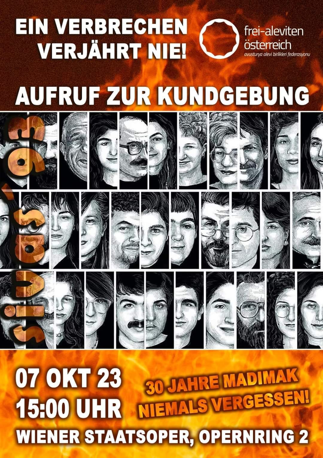 PİRHA- Avusturya Alevi Birlikleri Federasyonu, Sivas Madımak Katliamı davasında verilen zaman aşımı kararına karşı 7 Ekim’de sokağa çıkarak protesto eylemi gerçekleştirecek.