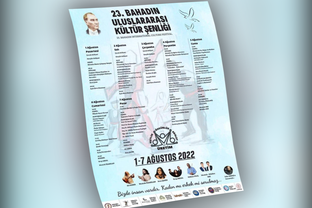 “01-07 Ağustos 2022 tarihleri arasında Bahadın’da gerçekleştireceğimiz ‘23. Bahadın Uluslararası Kültür Şenliği’mize siz tüm değerli dostlarımızı aramızda görmekten onur duyarız.