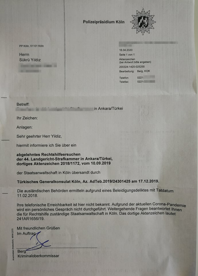 Davaya ilişkin PİRHA‘ya açıklamalarda bulunan Şükrü Yıldız, “Dava 2018 yılına ait. Bir kaç kez dava Türkiye’de görüldü. Şimdi de Almanya’ya havale edildi. Konsolosluk aracılığıyla dava takipleri yapılıyor. Muhalif kesimlere bir anlamda cadı avı yürütülüyor. Bununla, nerede olursanız olun sizi takip ediyoruz mesajı veriliyor. Bir tehdit ortamı oluşturarak insanları susmaya zorlamak istiyorlar” dedi.