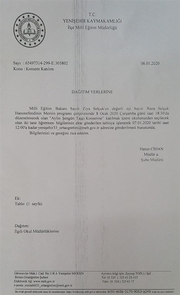 Mersin’in Yenişehir İlçe Milli Eğitim Müdürlüğü, okullara gönderdiği yazıda, Milli Eğitim Bakanı (MEB) Ziya Selçuk’un eşi Rana Selçuk’un katılacağı Aylin Şengün Taşçı konserinde, Selçuk’a eşlik edecek 2’şer öğretmen görevlendirilmesini istedi. Yazıda, “Milli Eğitim Bakanı Sayın Ziya Selçuk’un değerli eşi Sayın Rana Selçuk Hanımefendi’nin Mersin programı çerçevesindeki konsere katılmak üzere okulunuzdan seçilecek iki tane öğretmen bilgilerinin ekteki tabloya işlenmesi” şeklinde talimat verildi.
