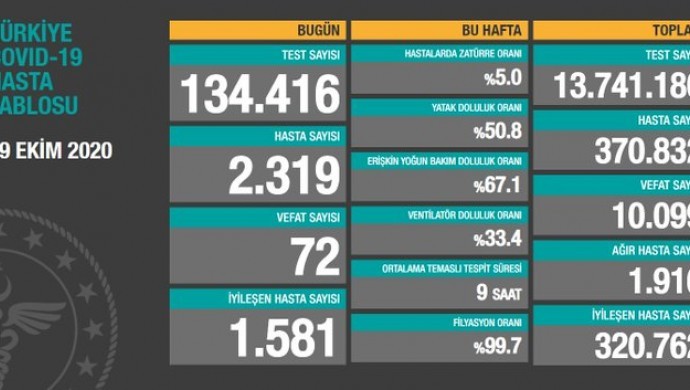 Tabloya göre Türkiye’de koronavirüs nedeniyle 72 kişi daha hayatını kaybetti, 2 bin 319 yeni hasta (semptom gösteren ve koronavirüs testi pozitif çıkan kişi) tespit edildi. Böylece toplam can kaybı 10 bin 99’a, hasta sayısı ise 370 bin 832’ye yükseldi.