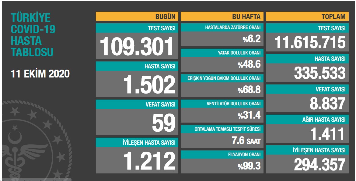 Türkiye’nin 11 Ekim 2020 güncel koronavirüs tablosu şöyle:
