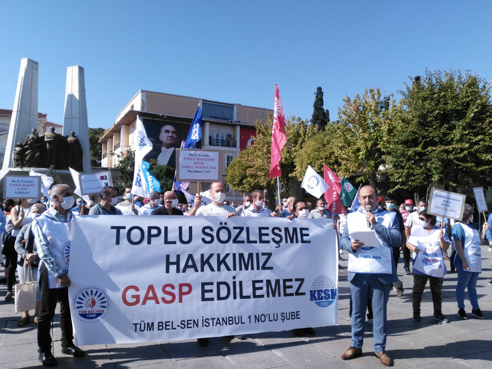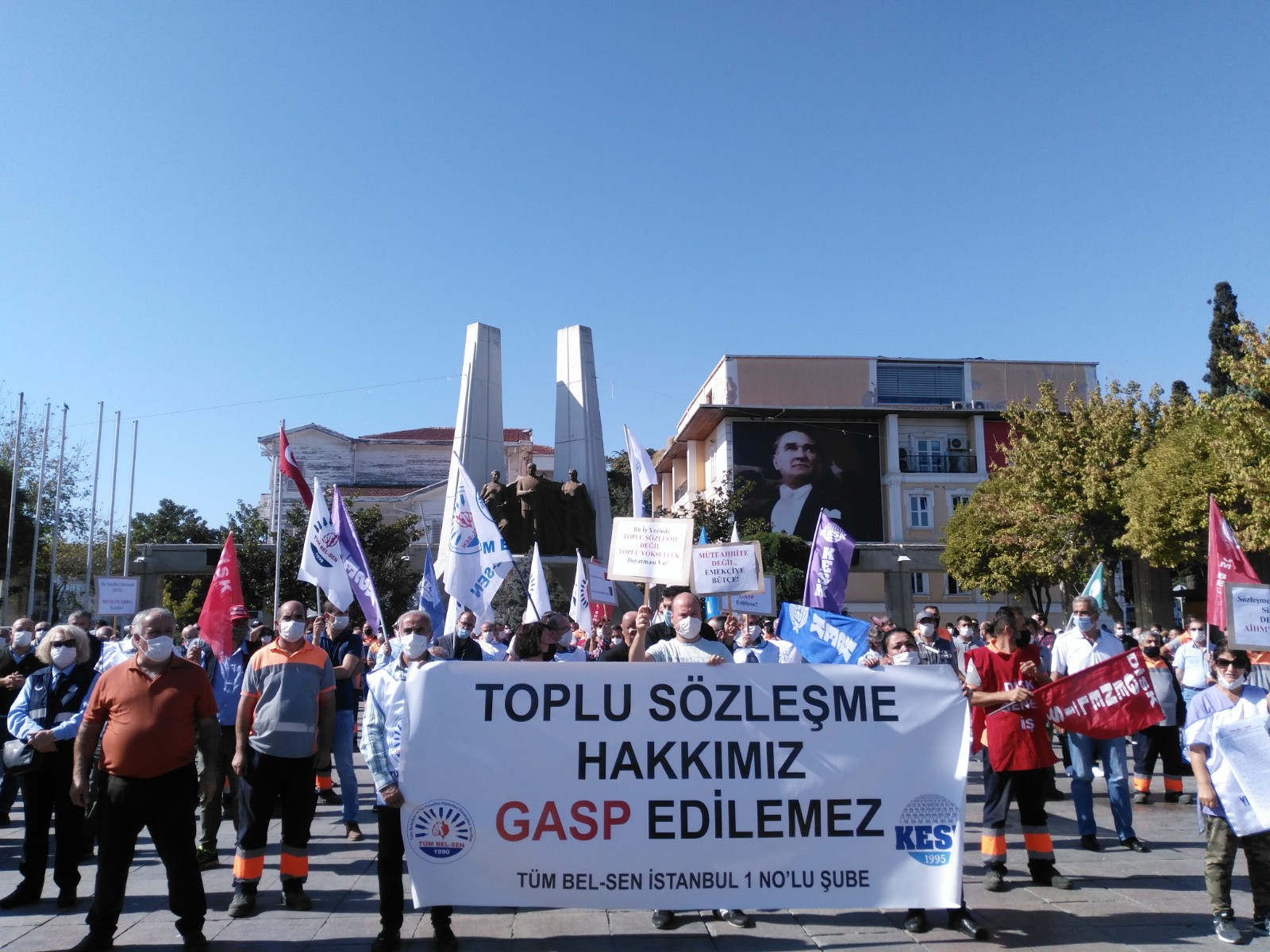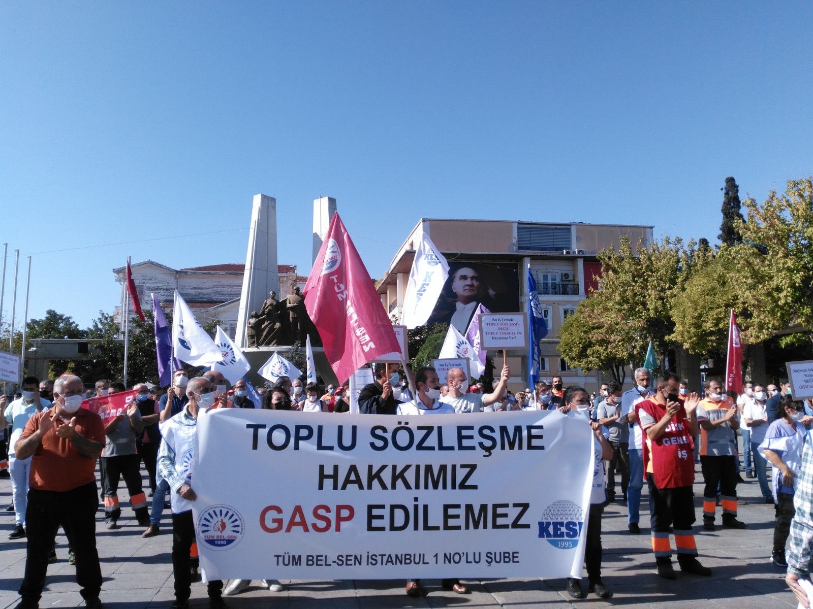 Bakırköy Belediyesindeki Genel-İş üyesi işçiler ile Tüm Bel-Sen üyesi emekçiler eylemlerinin üçüncü gününde açtıkları ‘Toplu iş sözleşme hakkımız gasp edilemez’ pankartı açarak TİS haklarını istedi.