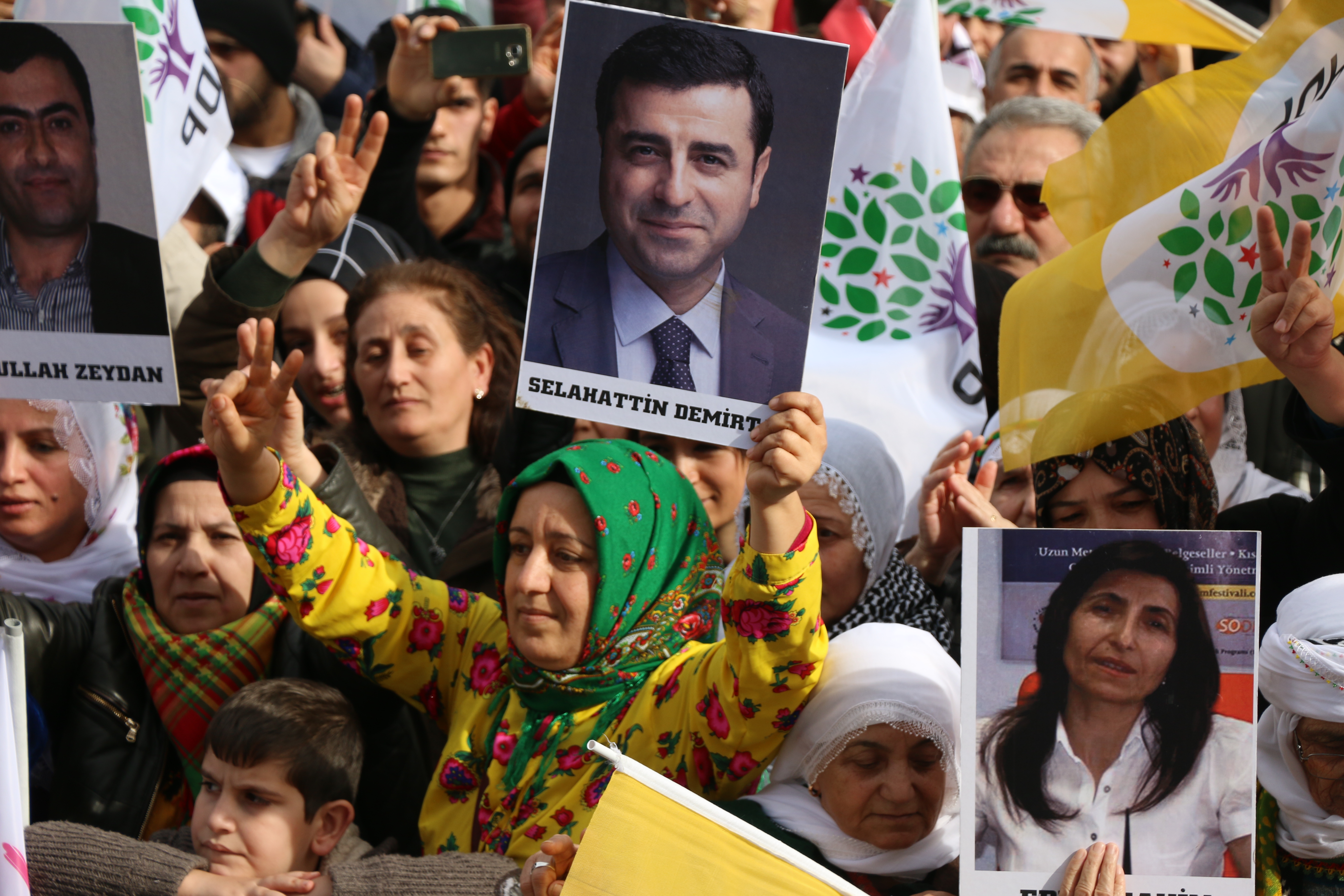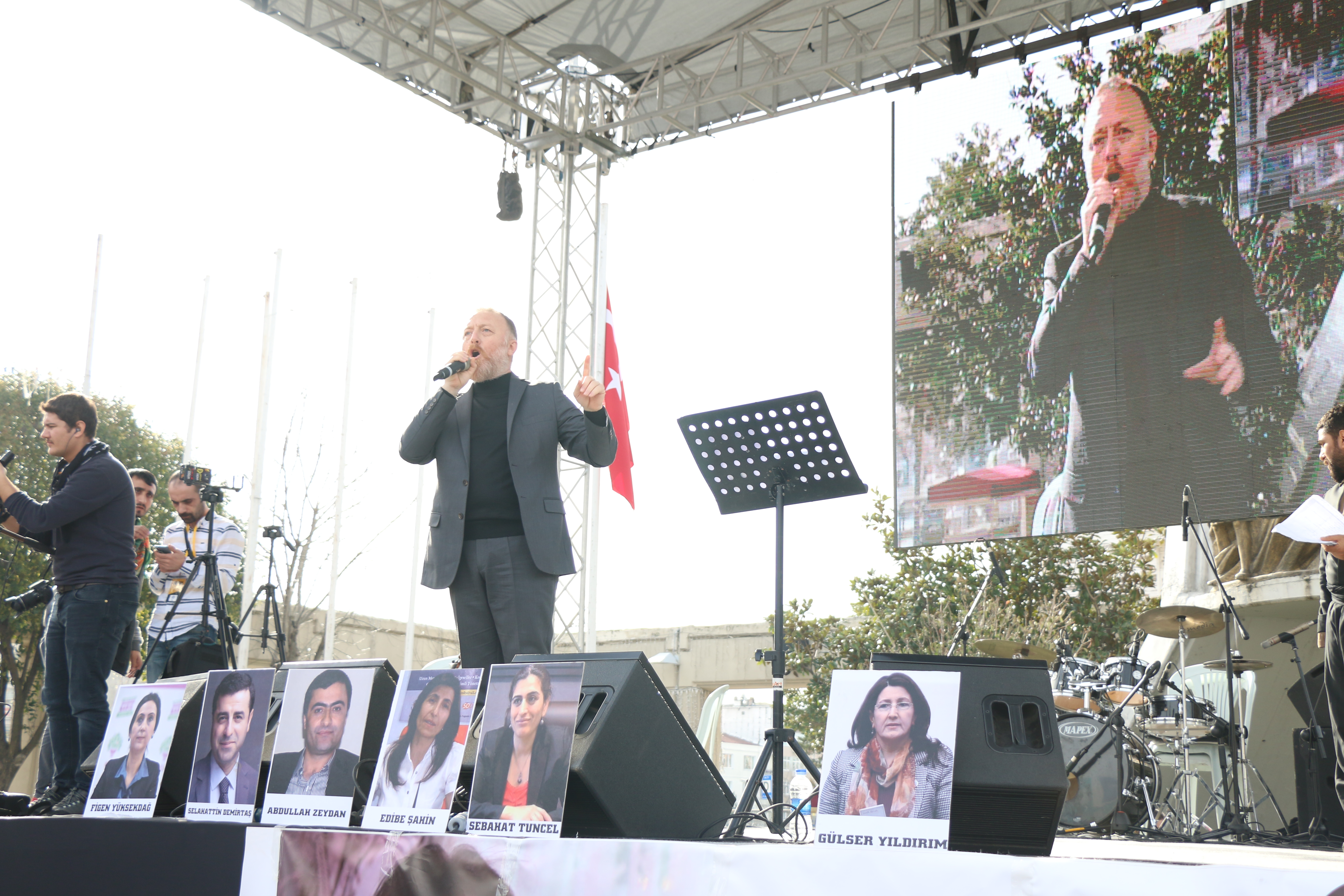 Bu ülkede artık yargı bağımsızlığı tarafsızlığı yok. İnsan hakları ihlalinde dünya birincisi. Bu ülkede hukukun üstünlüğü yok. Devlet hukuku çiğniyor. Yasaları tanımıyor. AİHM’in Selahattin Demirtaş ile ilgili verdiği kararı yok sayıyor. Uydurma fezlekelerle, yalanlarla arkadaşlarımızı yargılıyorlar. Adalet mahkeme salonlarını terk etmiş. Biz sizin bu kararlarınız tanımıyoruz, tanımayacağız. Onların bir suçu yok, onların bir sevdası var. Ama siz yargıyı talimatlarla yöneterek suç işliyorsunuz. Biz diyoruz ki bu ülkeye adalet geldiğinde bu suçu işleyenleri mutlaka yargının önüne çıkartacağız. Bu adaletsizlik hüküm sürdükçe barışın yolu tıkalıdır. Dünyanın her yerinde saygınlıkla anılan ve barış mücadelesi yapan arkadaşlarımız yargılanıyor. Yüzlerce barış akademisyenini cezalandırıyorlar. Neden? Barışın sesi duyulmasın diye. Bu mümkün mü? İşte barışın sesi burada, meydanlarda, sokaklarda.