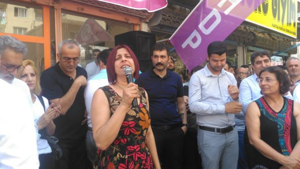 Barış Atay’dan sonra konuşan Hülya Kavuk ise HDP’nin bir kadın partisi olduğunu belirterek, “Bunun tam tersi olarak karşımızda kadın düşmanı bir AKP var. Biz kadınlar değiştireceğiz. Türkiye halklarının önemli bir partisi olan HDP değiştirecektir” ifadelerini kullandı.