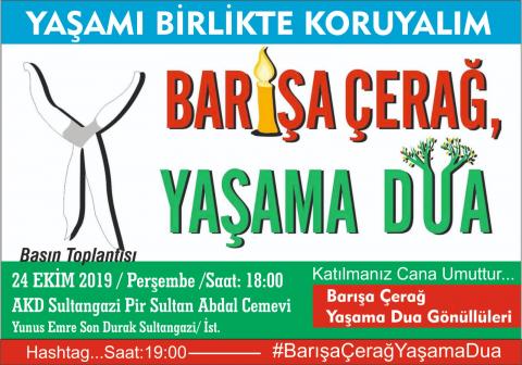 Barışa Çerağ Yaşama Dua Gönüllüleri, “Yaşamı birlikte koruyalım” şiarıyla 24 Ekim Perşembe günü saat 18.00’de AKD Sultangazi Pir Sultan Abdal Cemevinde basın toplantısı gerçekleştirecek.