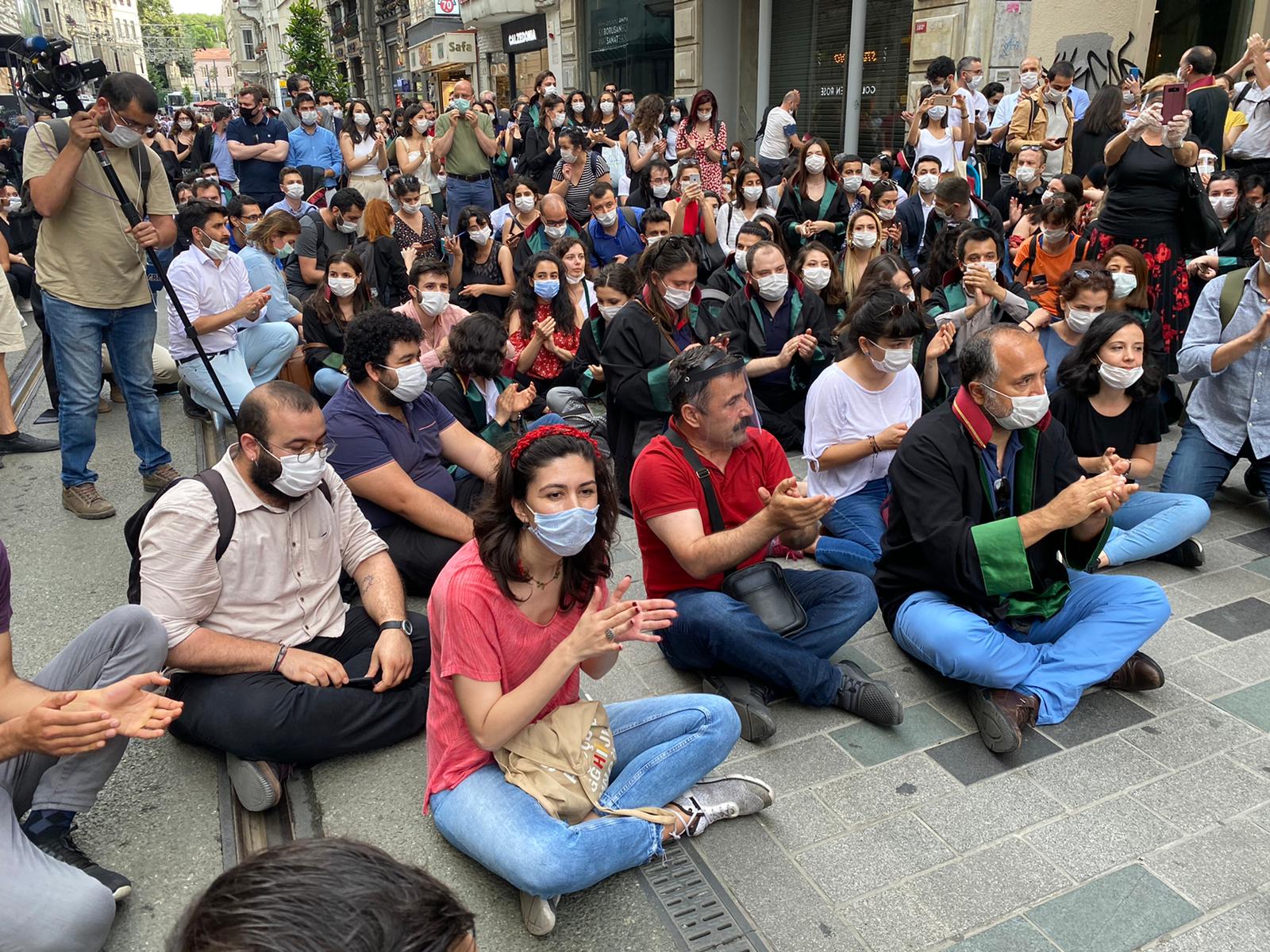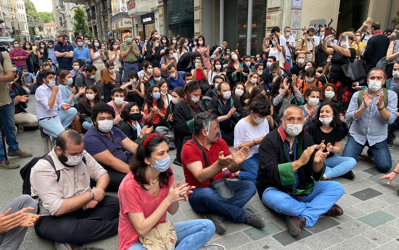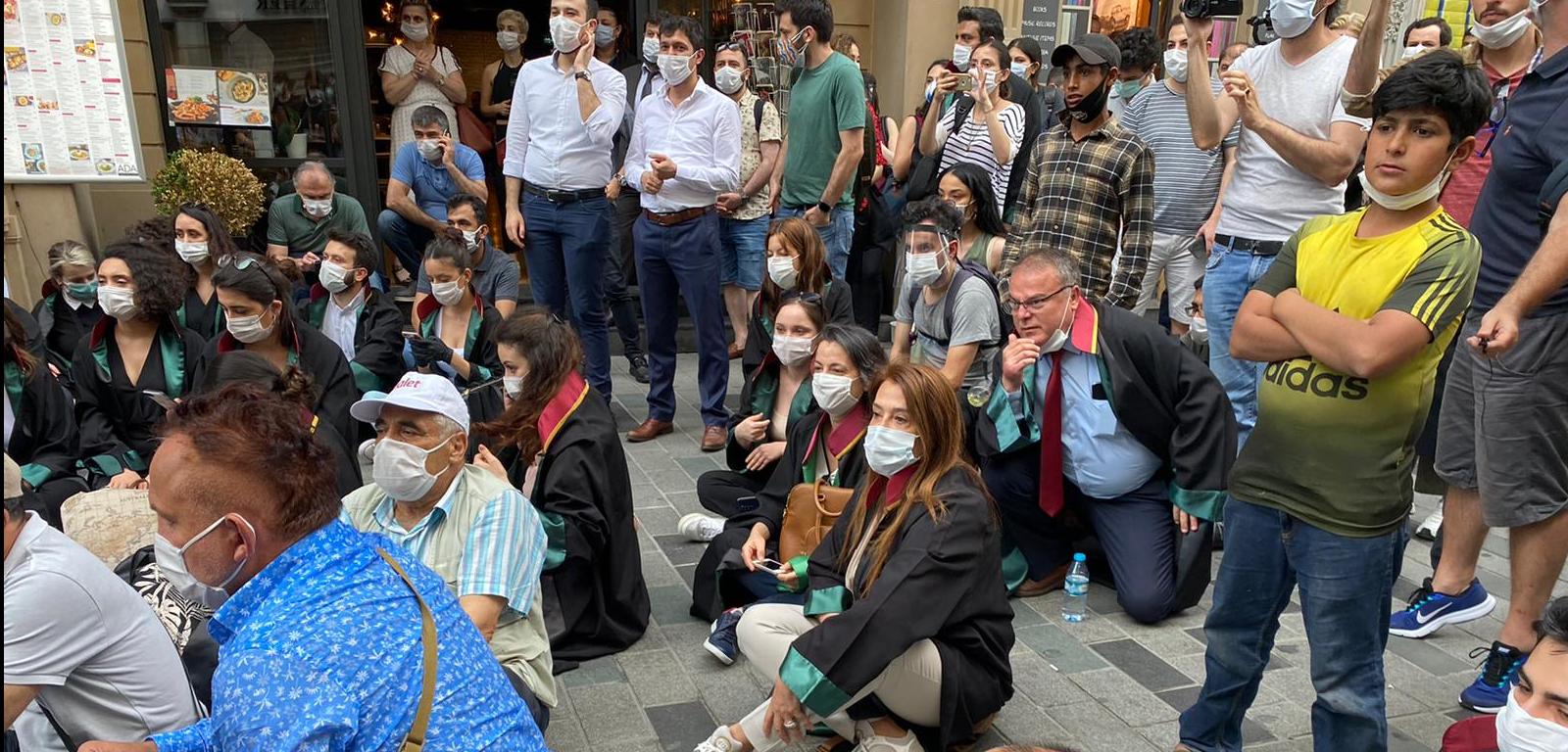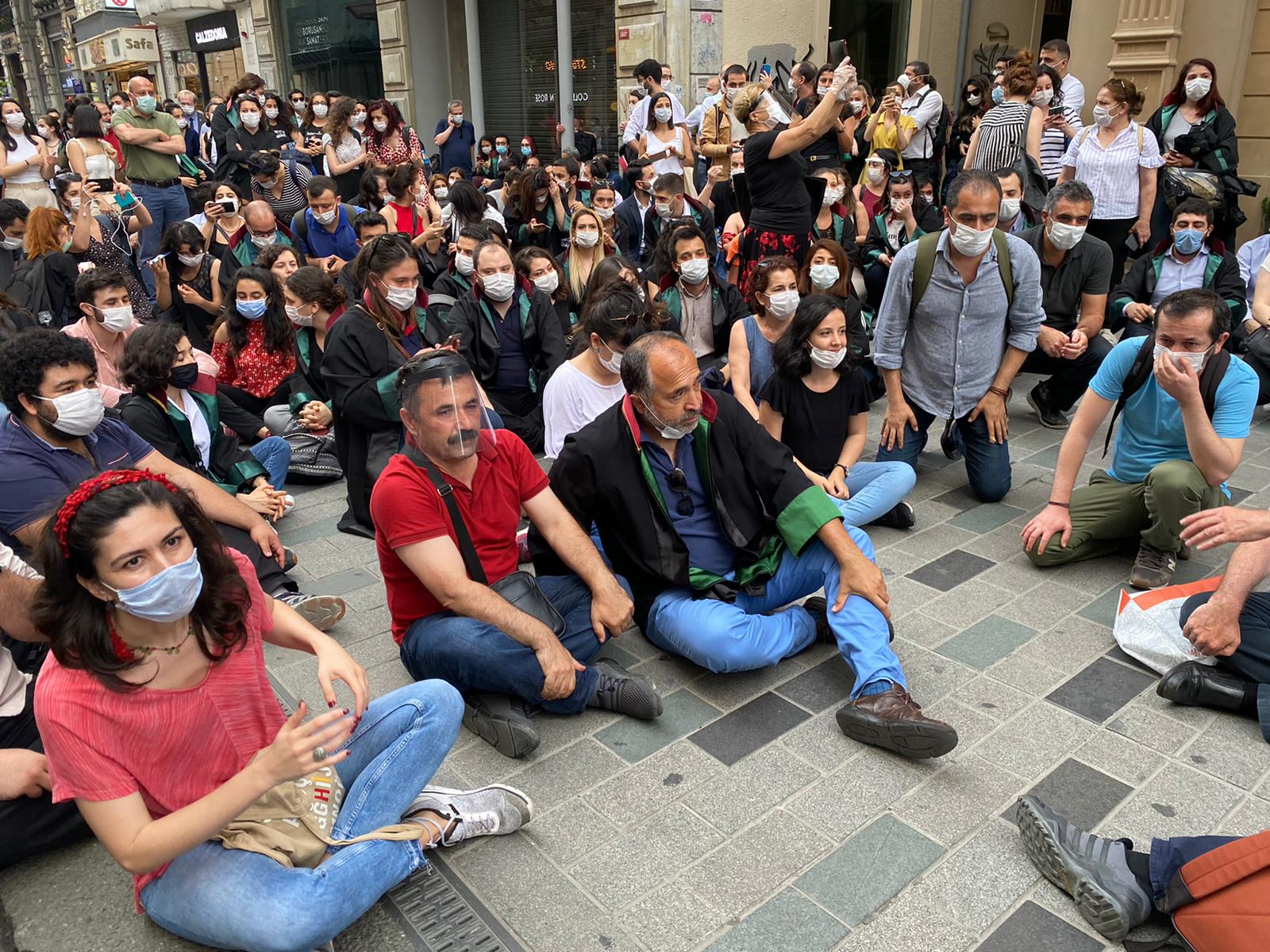 İstanbul’da avukatlar cübbeleriyle saat 18.30’da İstanbul Barosu önünde oturma eylemi yaptı. Eylemde Avukatlar “Feyzioğlu istifa” sloganları attılar.