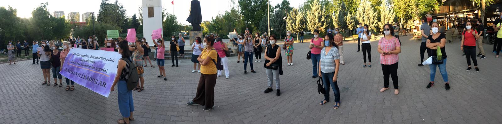 PİRHA- Ankara’da bir araya gelen kadınlar, İstanbul Sözleşmesi ve 6284 sayılı kanunu sonuna kadar savunacaklarını belirterek, “Toplumun gözü önünde suç işleyen katiller, kadın düşmanı iktidar sahipleri bilsinler ki, bedenimiz, emeğimiz ve kimliğimiz bizimdir” mesajı verdiler.